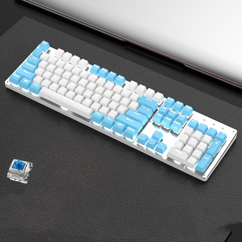 【機械鍵盤】【遊戲工作兼容青軸】【104鍵全鍵無衝】【金屬面板】AMOI藍白冷光專業電競商務104鍵金屬面板有線機械鍵盤
