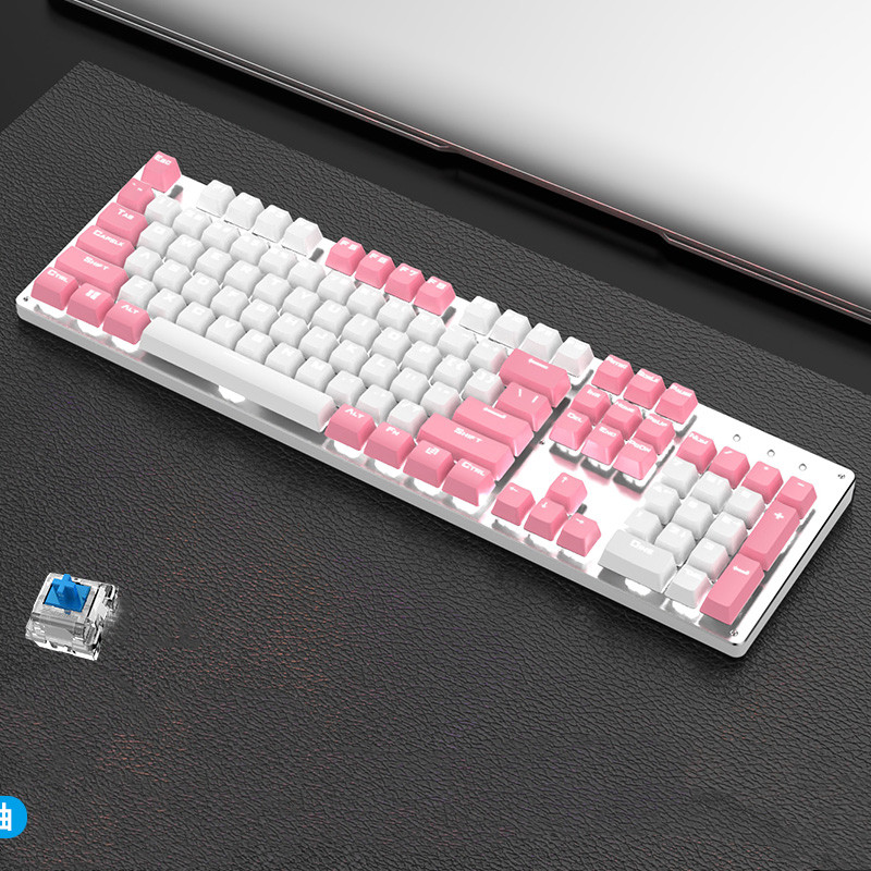 【機械鍵盤】【遊戲工作兼容青軸】【104鍵全鍵無衝】【金屬面板】AMOI粉白少女專業電競商務104鍵金屬面板有線機械鍵盤