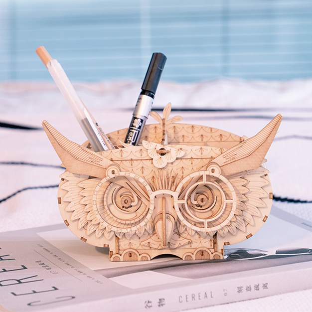 【貓頭鷹收納盒】【3D夢幻拼圖】【俄羅斯原採椴木】設計師款創意手作3D夢幻實木拼圖DIY桌面擺設