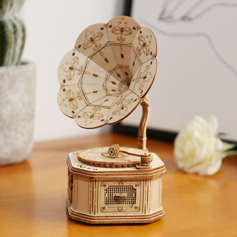 【漫調留聲機】【3D夢幻拼圖】【俄羅斯原採椴木】設計師款創意手作3D夢幻實木拼圖DIY桌面擺設