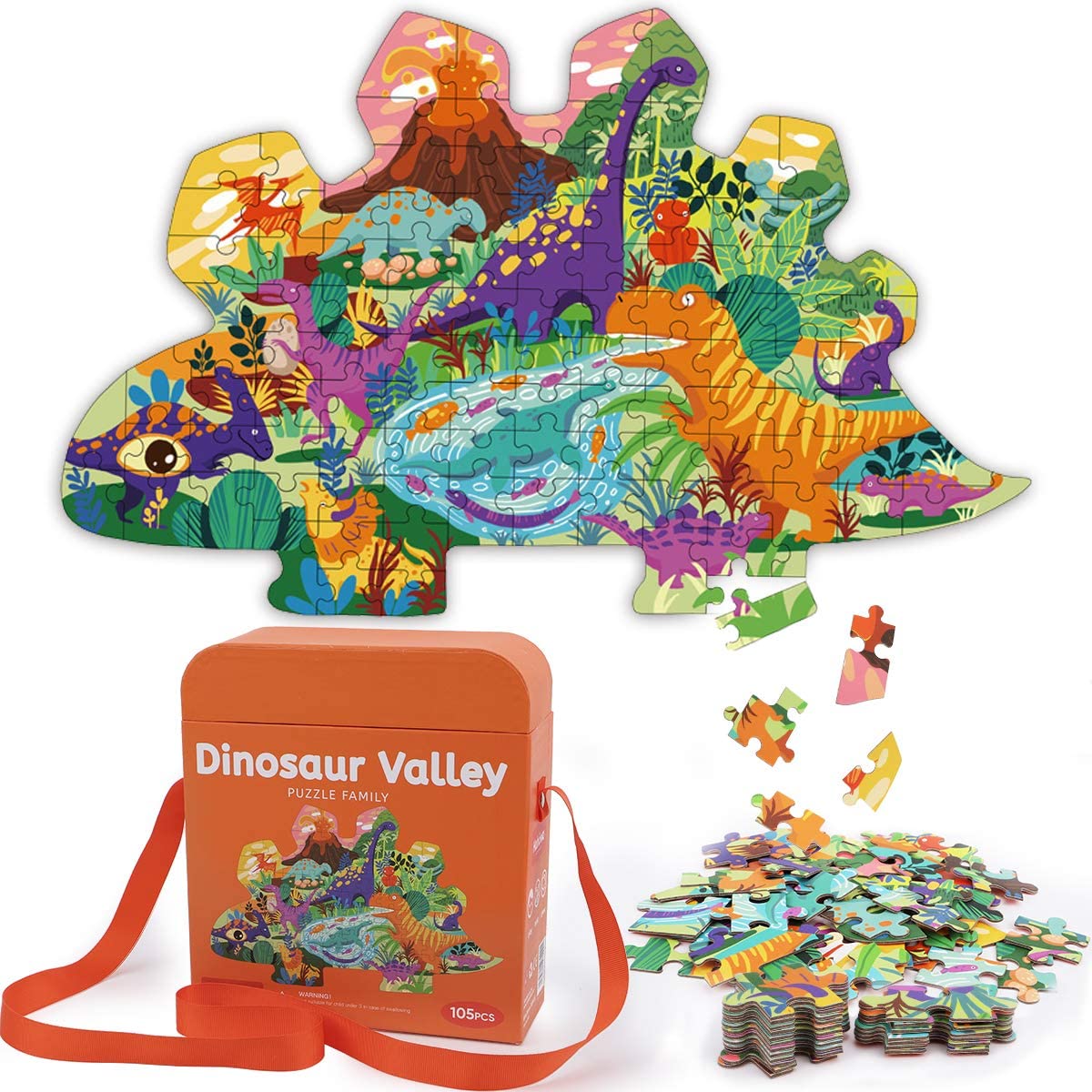 【105片恐龍造型拼圖】【全環保材質】【光滑不傷手】【送收納包】日本熱銷超可愛趣味105片恐龍造型侏羅紀主題成人兒童拼圖