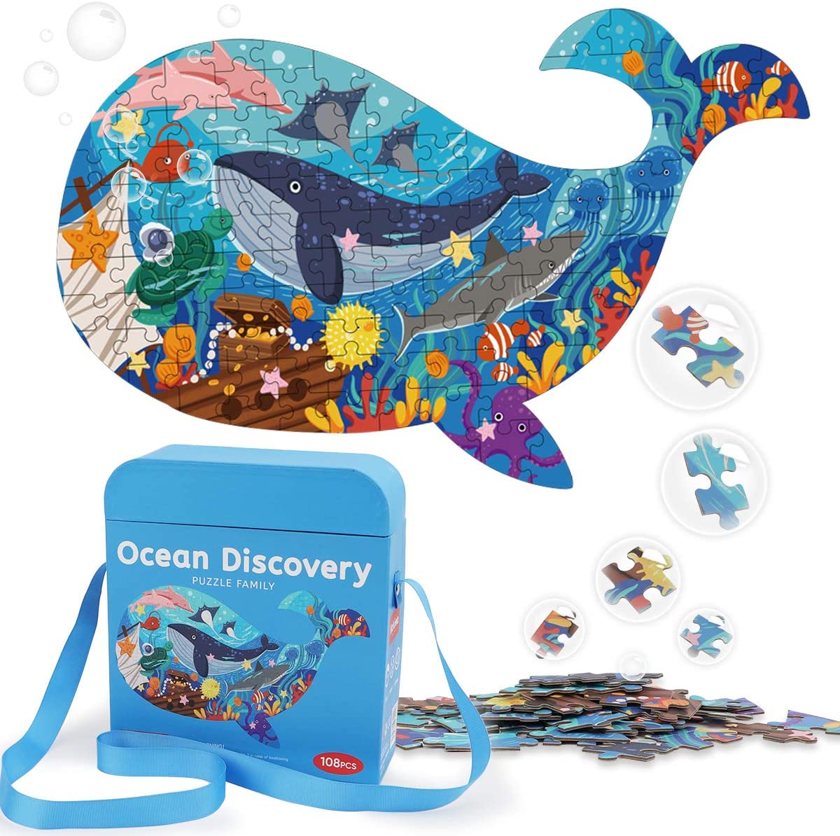 【108片鯨魚造型拼圖】【全環保材質】【光滑不傷手】【送收納包】日本熱銷超可愛趣味108片鯨魚造型海洋主題成人兒童拼圖
