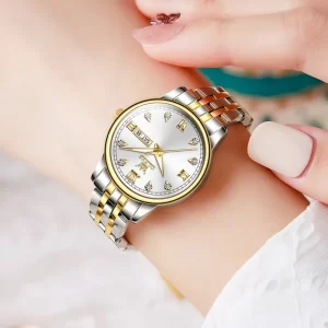 女錶・歲月鎏金 | 經典鎏金小圓盤 | 星期日曆雙曆視窗 | 實心精鋼錶帶 | 鑲鑽刻度 | 高清夜光 | 30米防水 | 瑞士OLEVS經典女士腕錶