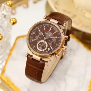 女錶・時序之花 | 真三眼計時機芯 | 精緻玫金錶殼 | 小牛皮錶帶 | 鑲鑽刻度 | 日曆視窗 | 30米防水 | GUOU經典設計女神手錶