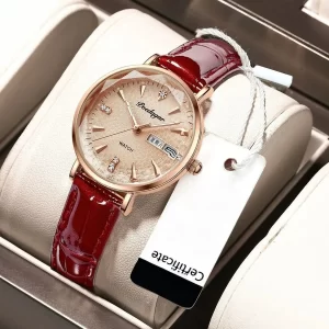 女錶・時光戀旅人 | 鑽石花型錶鏡 | 勃艮第紅皮錶帶 | 太陽鑽型時刻 | 日本高級石英機芯 | 星期日曆顯示 | 50米防水 | 瑞士POEDAGAR女錶