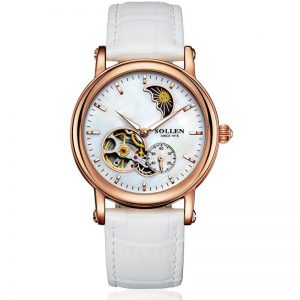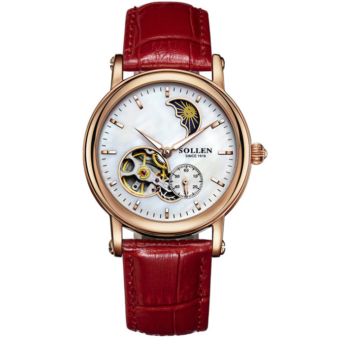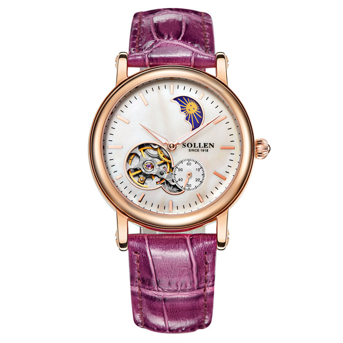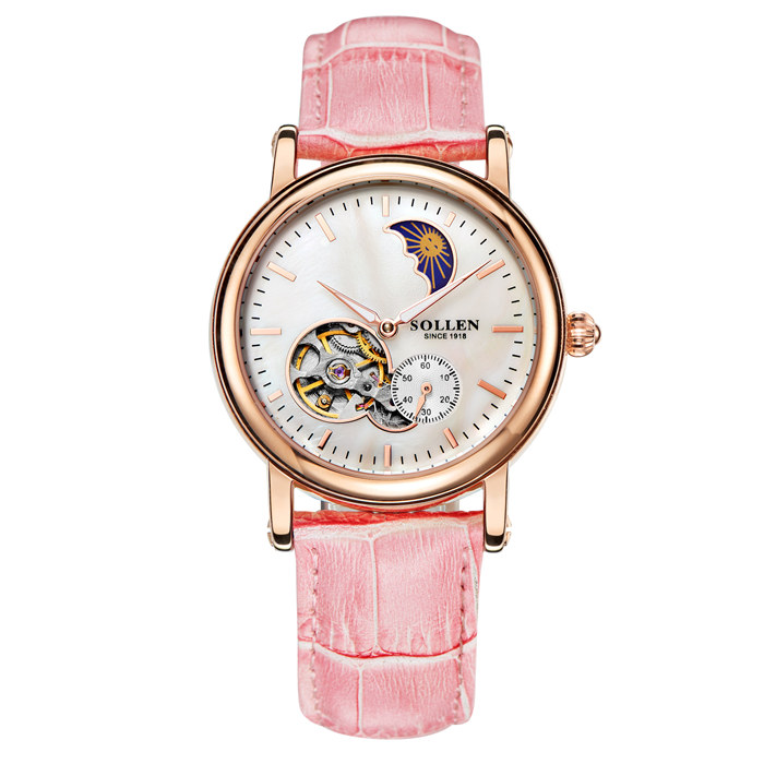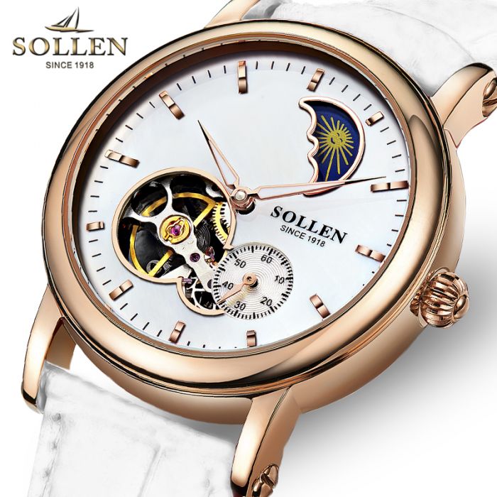 【自動機械錶】【月相顯示】【鏤空飛輪】【防水】瑞士SOLLEN日月星辰小牛皮錶帶防水全自動機械女神腕錶