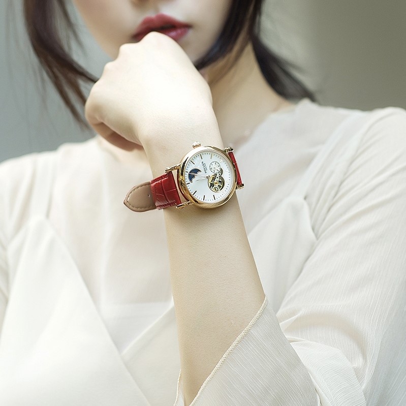 瑞士女生全自動鏤空機械錶 | 星辰月相顯示 | 高效自動上鍊機芯 | 30米生活防水 | 瑞士SOLLEN日月星辰小牛皮錶帶防水全自動機械女神腕錶