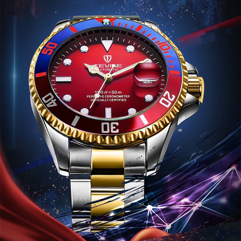 深潛型水鬼腕錶 | 全自動機械機芯 | 炫彩深潛錶盤 | 視距旋轉錶殼 | 礦物水晶錶鏡 | 水滴日曆 | 高清強視夜光 | 瑞士TEVISE男士全自動機械錶