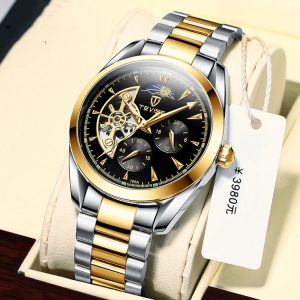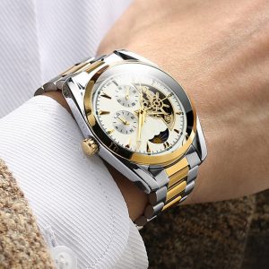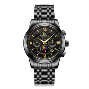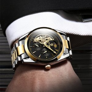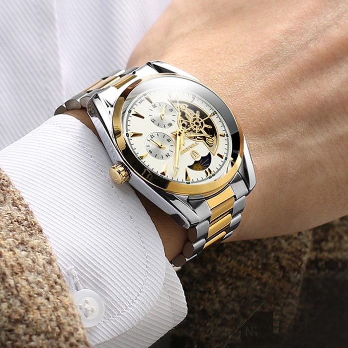 全自動多功能自動機械錶 | 月相顯示 | 三眼六針 | 星期日曆 | 實心精鋼錶帶 | 奢華精鋼月相三眼日曆跑秒計時多功能鏤空全自動機械錶男錶