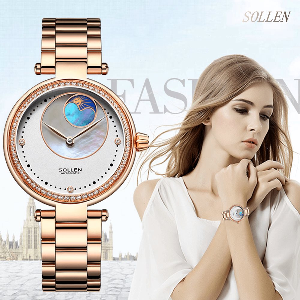 【萬元級全自動機械錶】【月相顯示】【獨立小秒盤】【防水】瑞士SOLLEN日月星辰小牛皮錶帶防水全自動機械女神腕錶