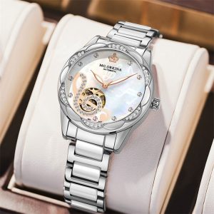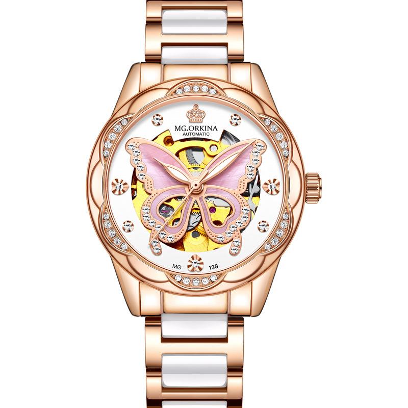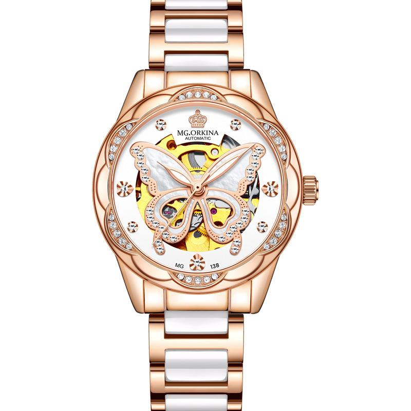 全自動機械機芯 | 名媛陶瓷錶帶 | 蝴蝶貝母錶盤 | MG.ORKINA奢華全自動機芯陶瓷錶帶櫻花鑲鑽鏤空錶盤手錶OL小資女神手錶