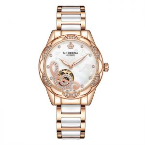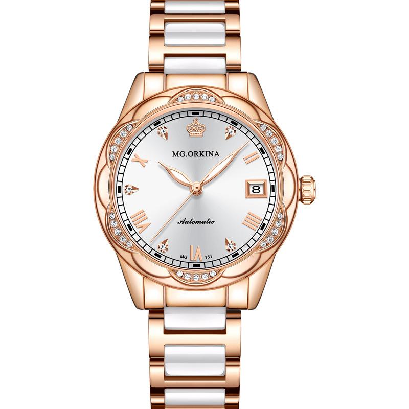 【全自動機械機芯】【陶瓷錶帶】【日曆顯示】MG.ORKINA高檔全自動機芯陶瓷錶帶櫻花鑲鑽鏤空錶盤手錶OL小資女錶