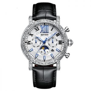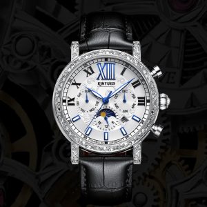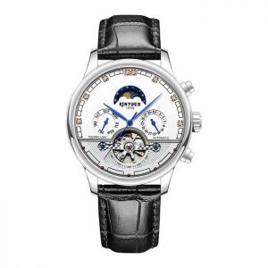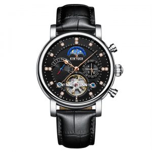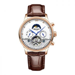 大師級陀飛輪全自動機械腕錶 | 超強動能儲備 | 鏤空星河月相 | 兩眼兩針 | 藍寶石鏡面 | 小牛皮帶 | KINYUED男士陀飛輪全自動機械手錶