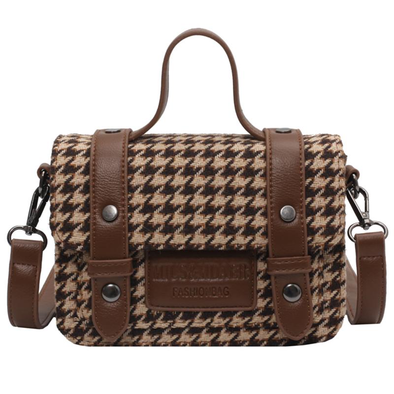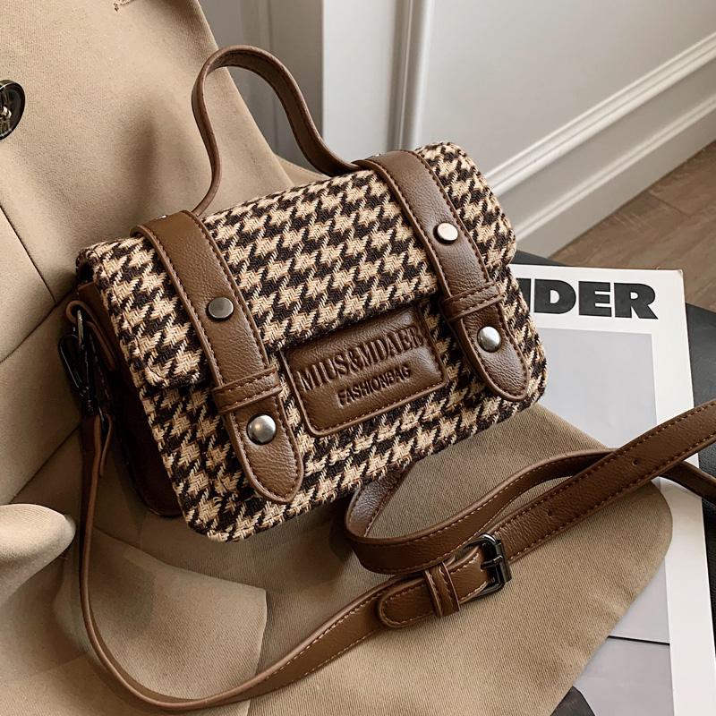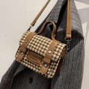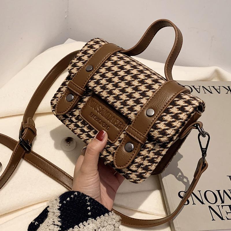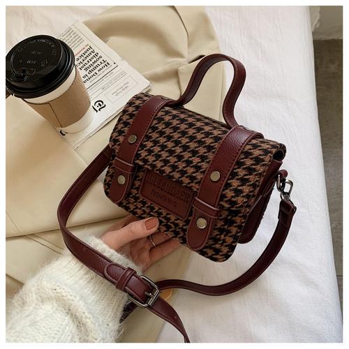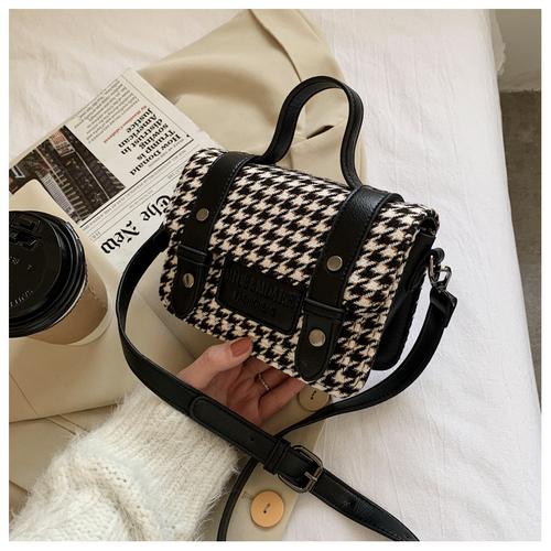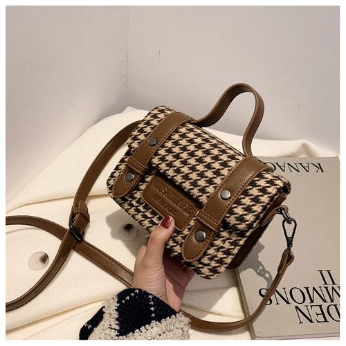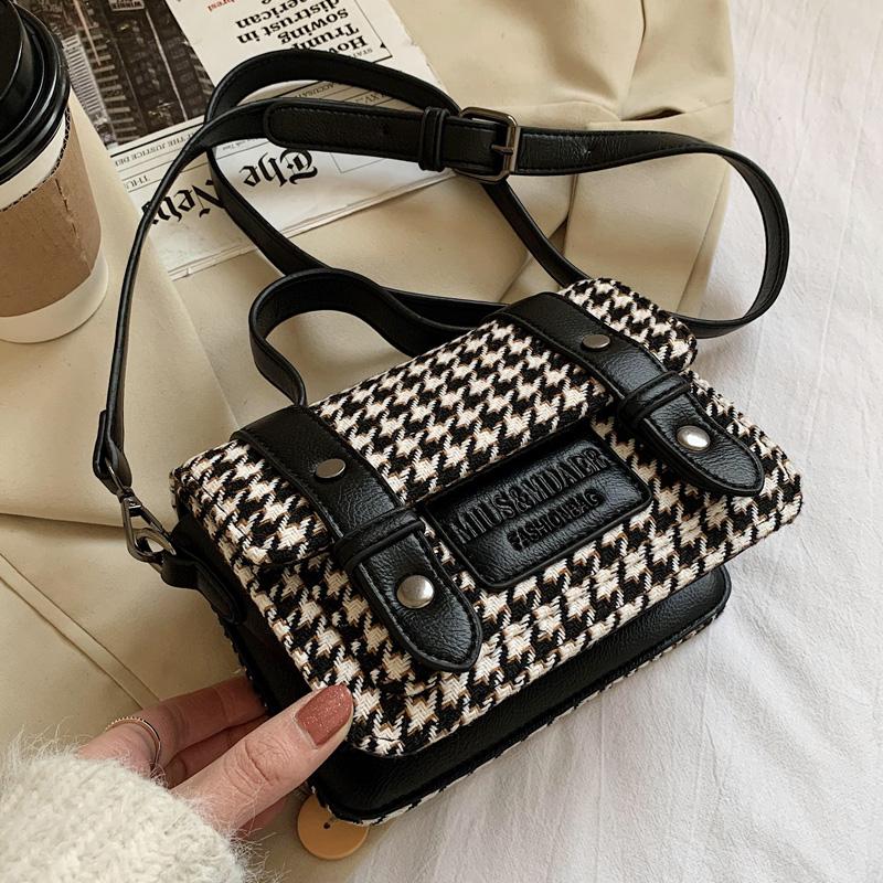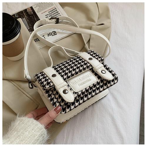 秋冬復古氣質千鳥格毛呢拼接小方包女百搭單肩側