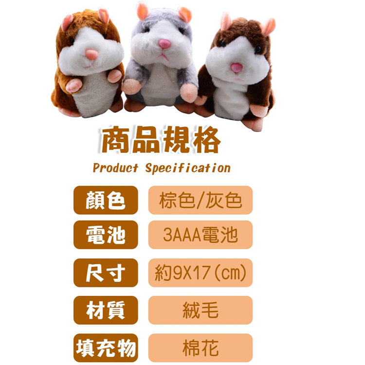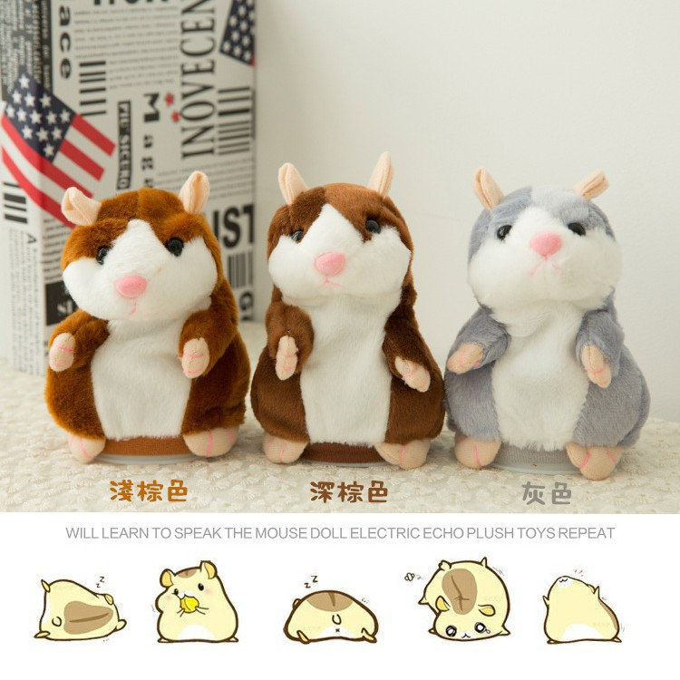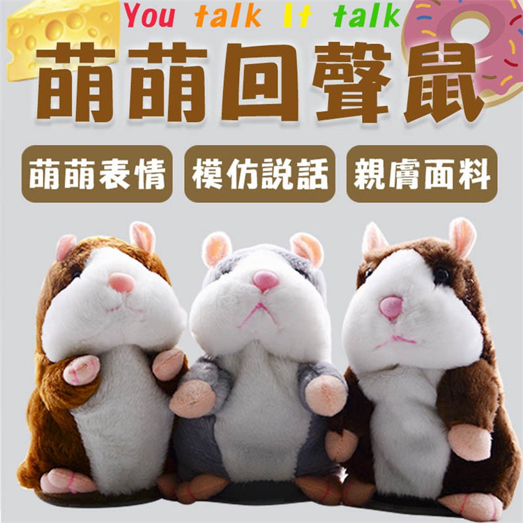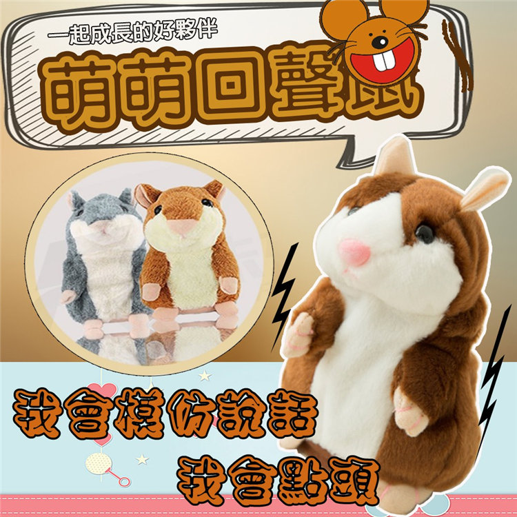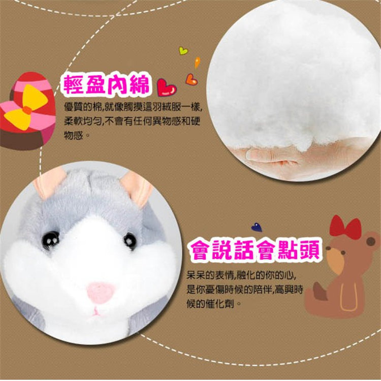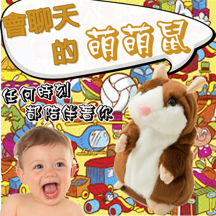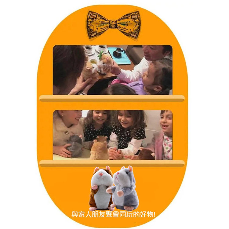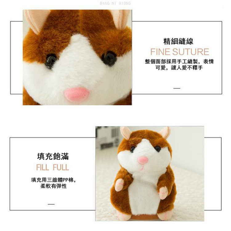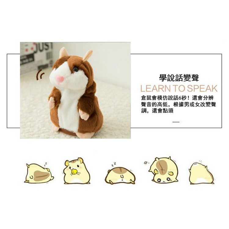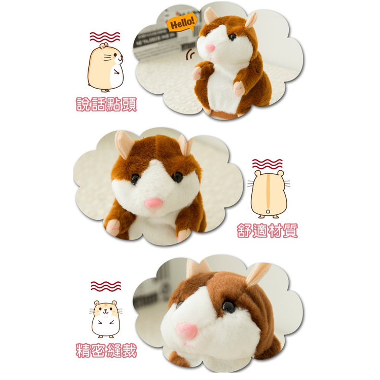 可愛的倉鼠,會模仿你說的話六秒,還會分辨出聲音的高低, 甚至是男或女聲而改變聲調,還會做出點頭的動作,是陪伴自 己孩子跟毛小孩的最佳秘密武器唷!光是學它們講話就可以玩上一天!說話連帶動作的可愛倉鼠,學說話的倉鼠是當人們說話時用滑稽動作和可愛的聲音跟著學話的一種新概念玩具。無論作為孩子的玩具還是作為裝飾品都不遜色的魅力四色品!請大家見識下散發著獨特魅力的倉鼠娃娃吧!