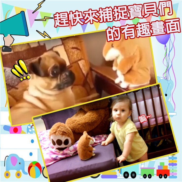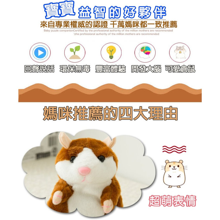 可愛的倉鼠,會模仿你說的話六秒,還會分辨出聲音的高低, 甚至是男或女聲而改變聲調,還會做出點頭的動作,是陪伴自 己孩子跟毛小孩的最佳秘密武器唷!光是學它們講話就可以玩上一天!說話連帶動作的可愛倉鼠,學說話的倉鼠是當人們說話時用滑稽動作和可愛的聲音跟著學話的一種新概念玩具。無論作為孩子的玩具還是作為裝飾品都不遜色的魅力四色品!請大家見識下散發著獨特魅力的倉鼠娃娃吧!