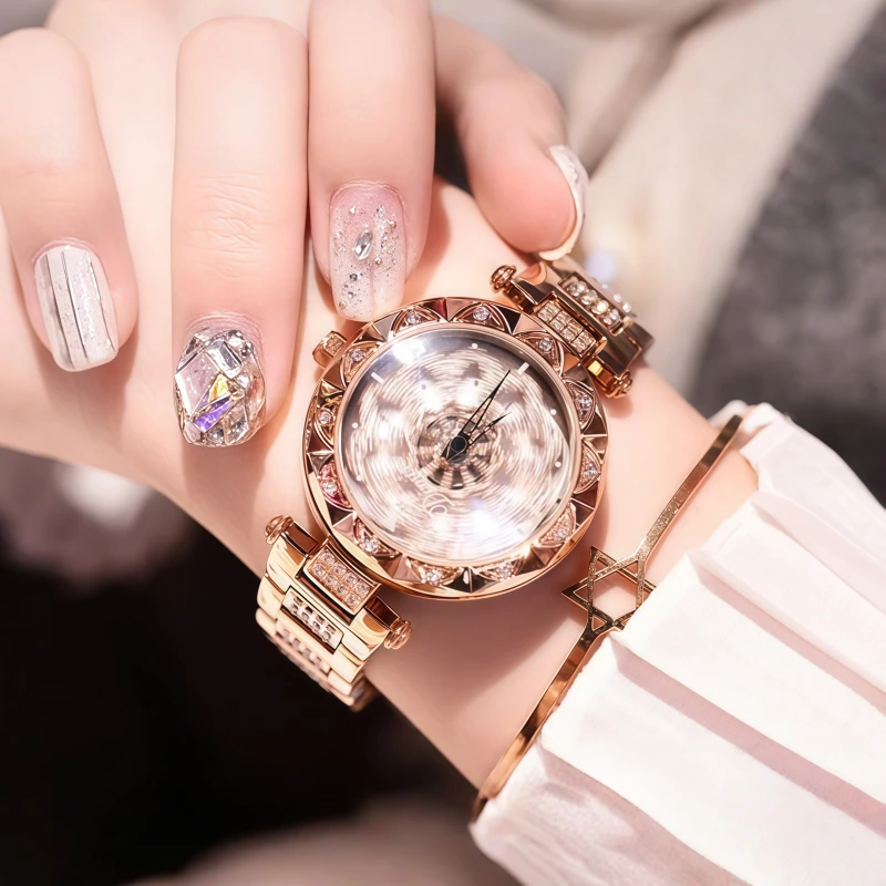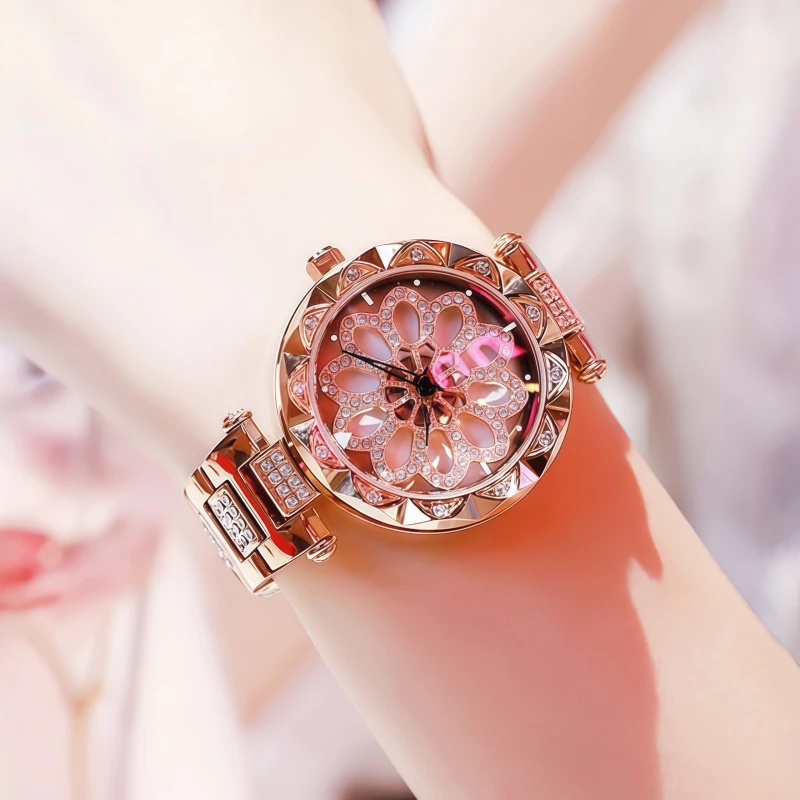 女錶・時來運轉 | 心動旋轉花瓣錶盤 | 日本高級星辰機芯 | 鑲鑽玫金鋼帶 | 礦物鍍膜錶鏡 | 30米防水 | ABORNY輕奢開運石英女錶
