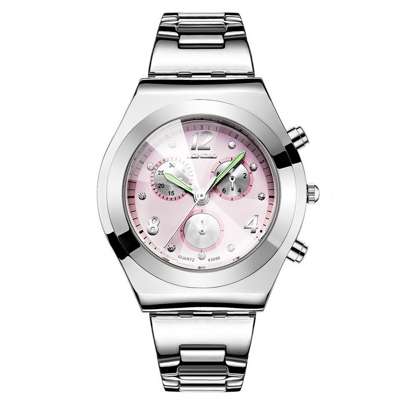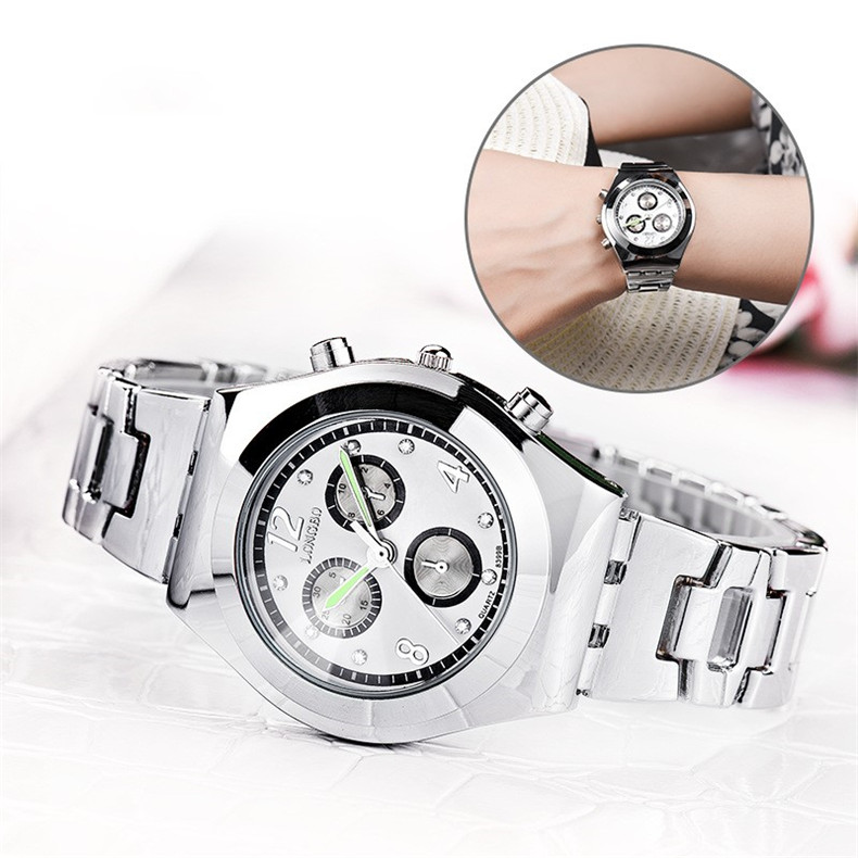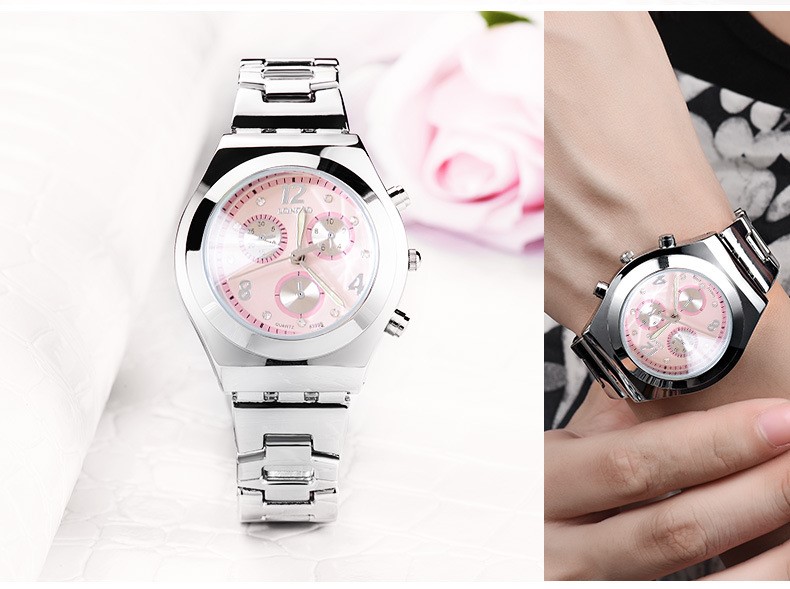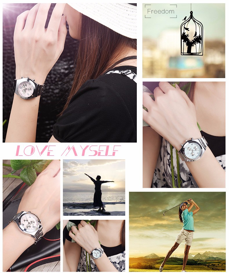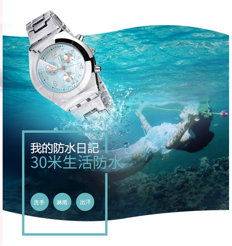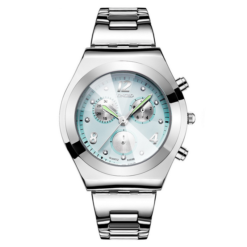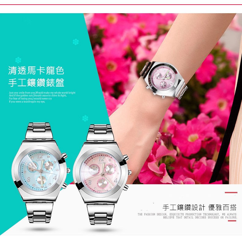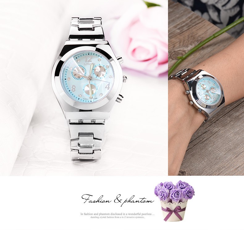 【鑲鑽三眼時裝錶】LONGBO歐美風格時尚優雅鑲鑽三眼夜光防水精鋼錶帶時裝錶
