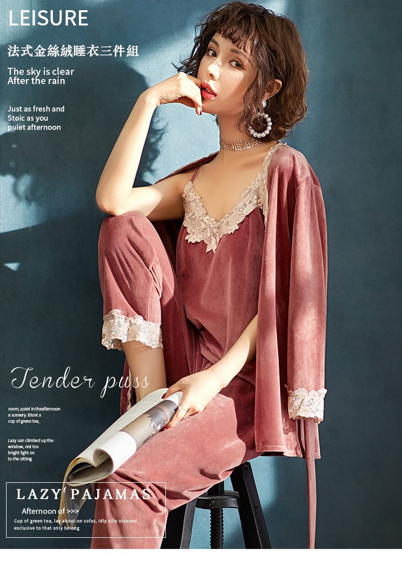 【法式蕾絲金絲絨】【三件套組】高檔法式性感舒適親膚金絲絨蕾絲居家睡衣三件式套組