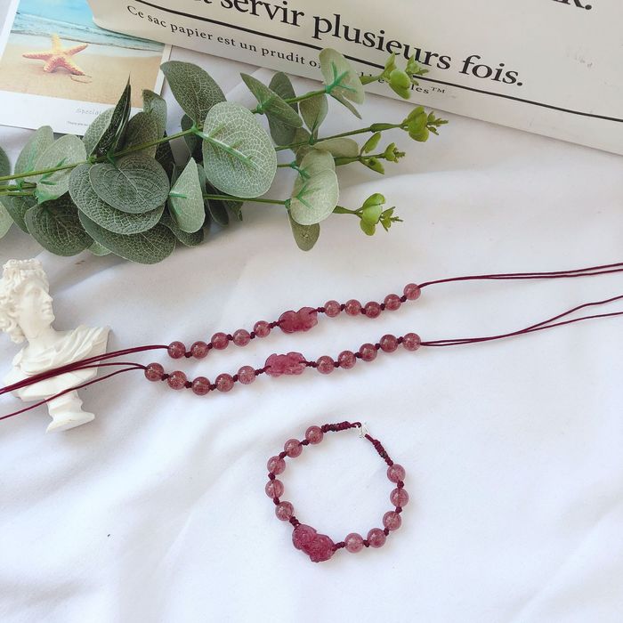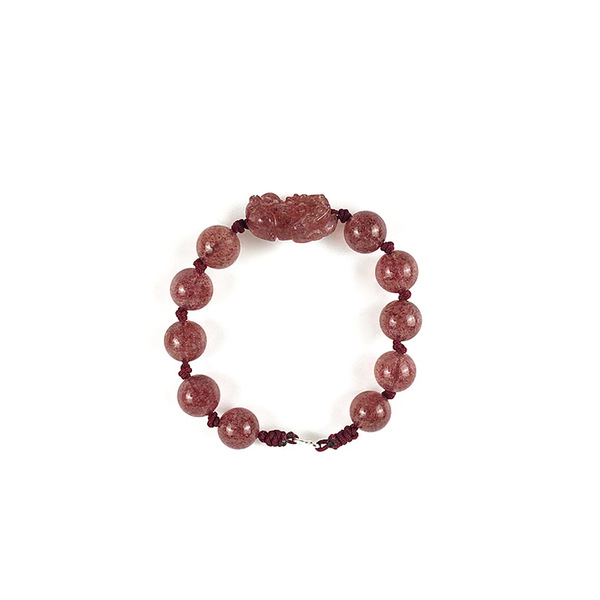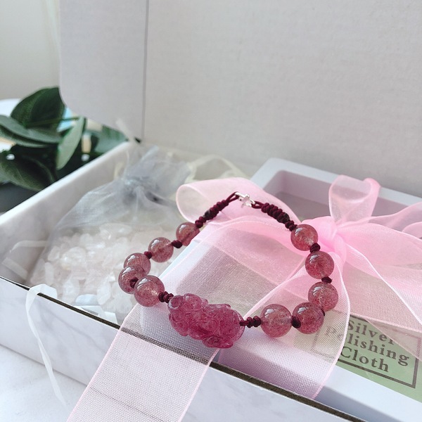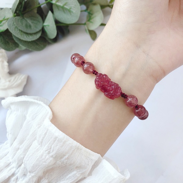 【招財草莓晶貔貅手鍊】【編織手作紅繩】原創手作姻緣招財草莓晶貔貅編織紅繩手鍊