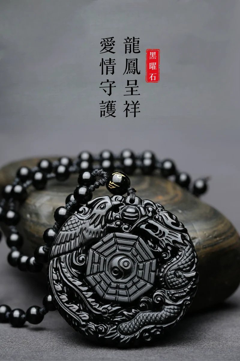 龍鳳八卦 | 穩固感情 | 天然黑曜石龍鳳太極八卦項鍊 | 夫妻和睦 | 小三退散 | 大師手工精細微雕龍鳳八卦黑曜石項鍊
