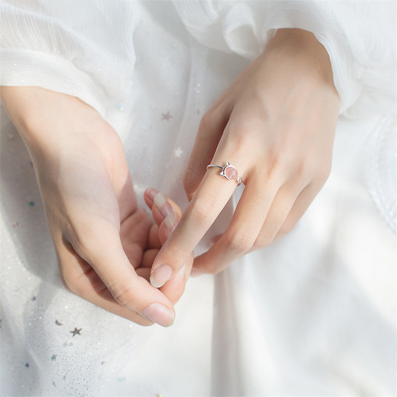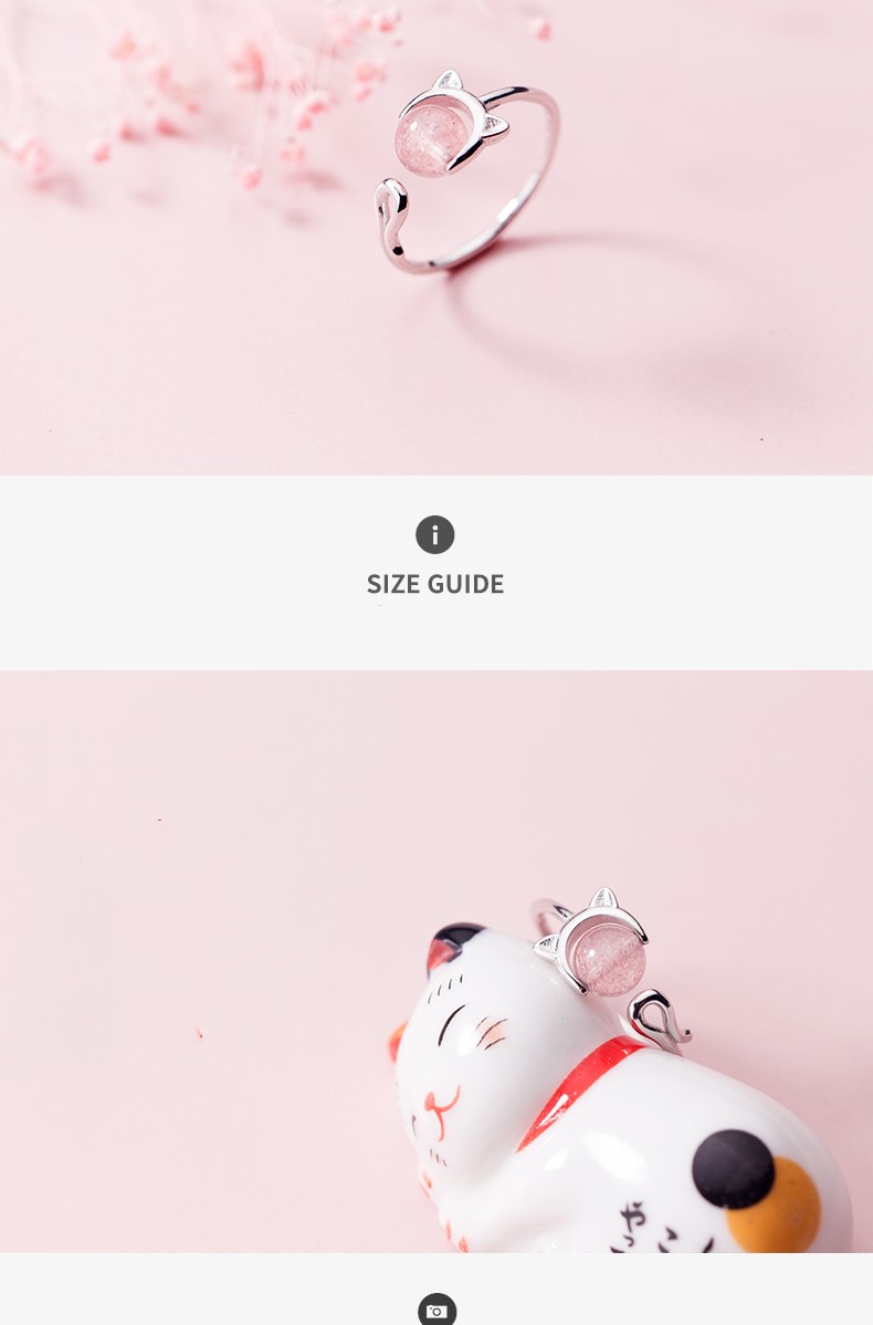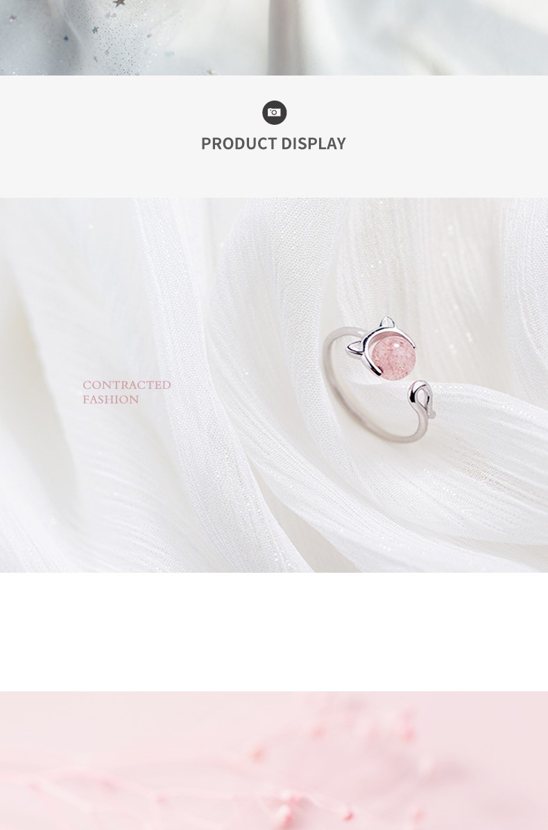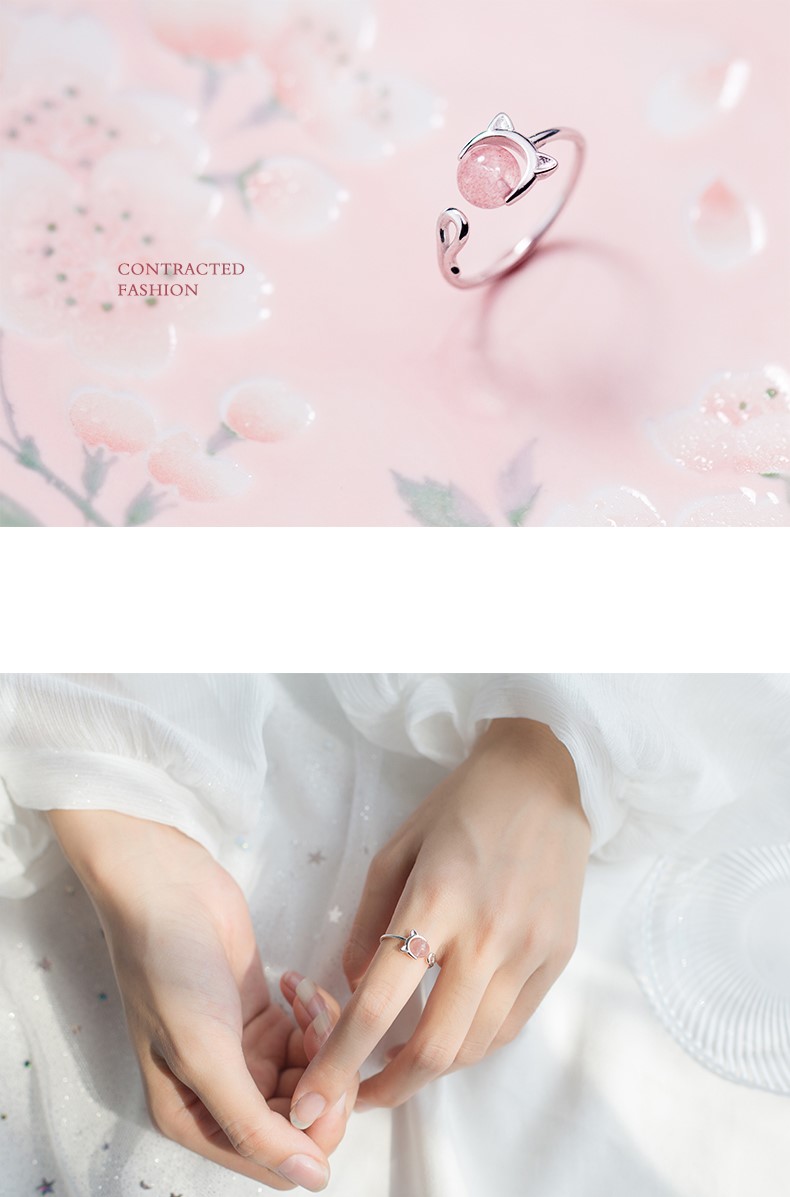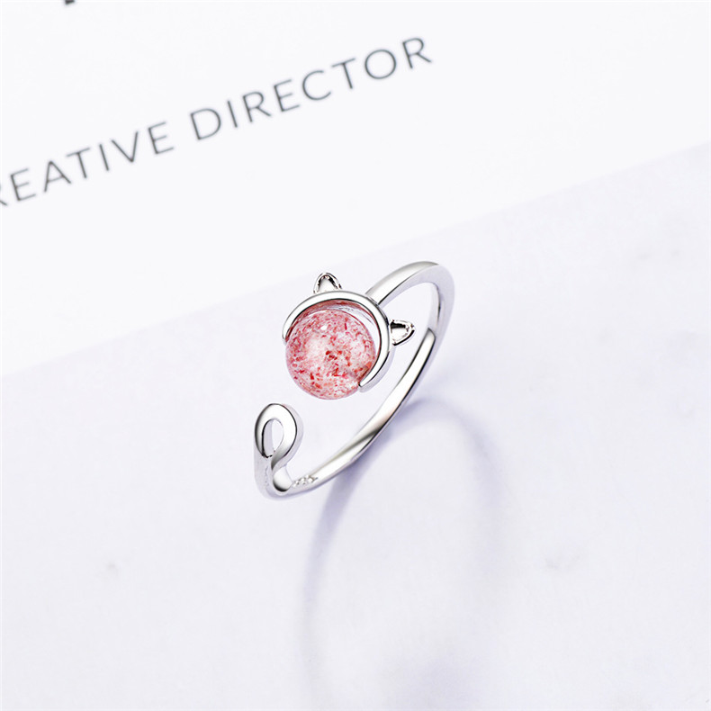 【姻緣草莓晶戒指】【925純銀】日系簡約甜美貓耳s925純銀6A級草莓晶姻緣開口戒指