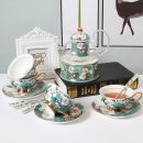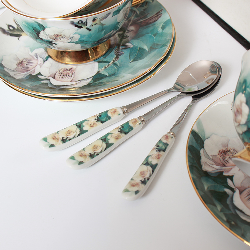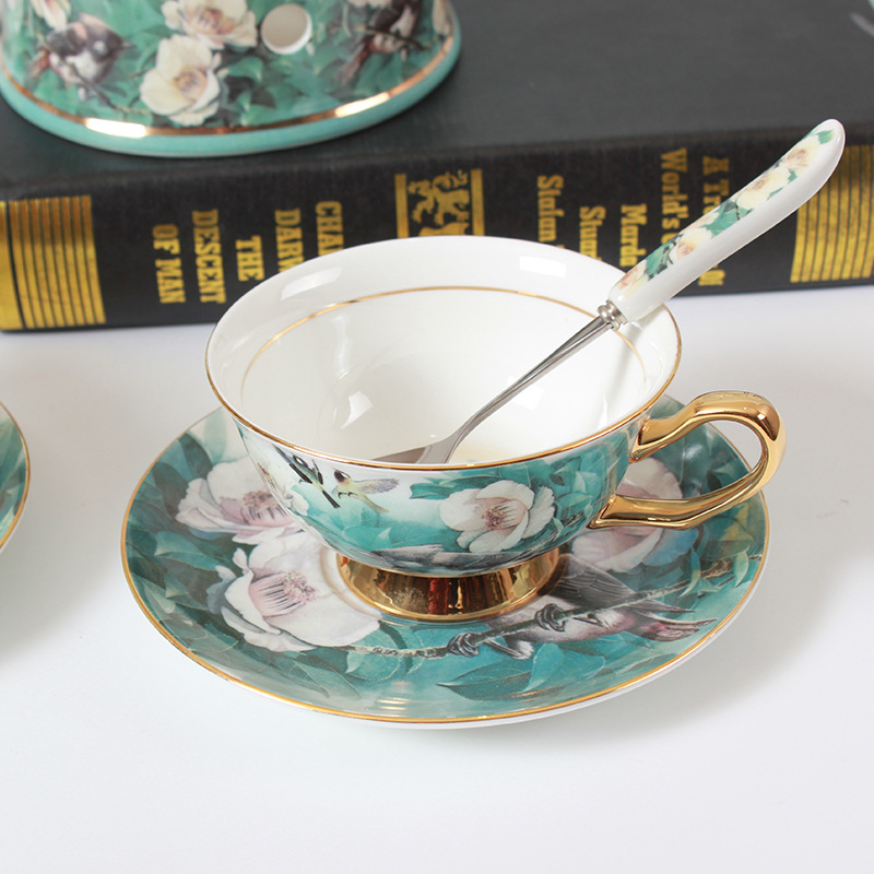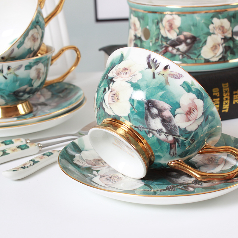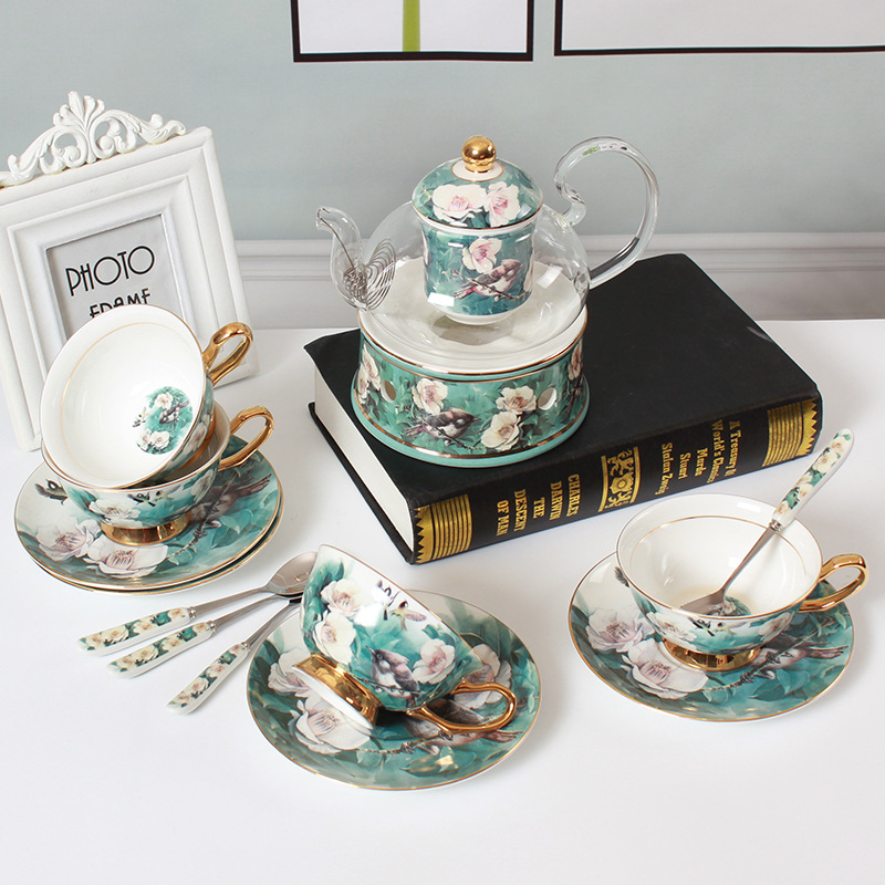 【英式古典帶爐座茶器套組】【手繪花鳥】高檔輕奢英式古典手繪花鳥茶具套組 (一壺一爐座四杯四碟四勺)