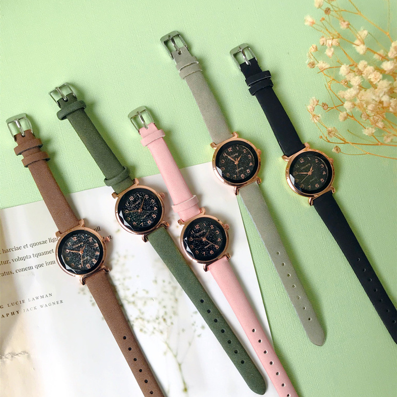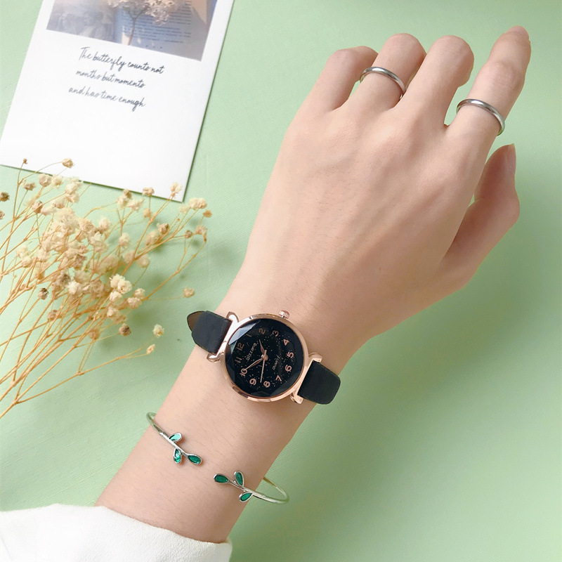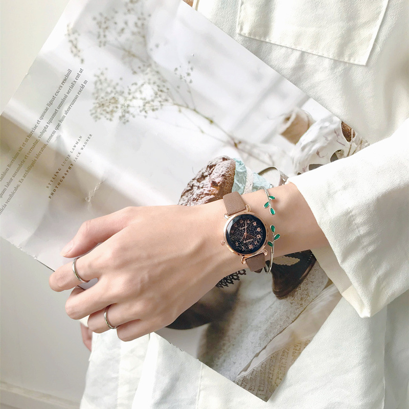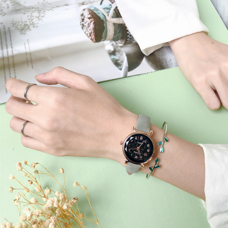 【鑽石切割星空錶盤】【贈送手鐲】法國小眾森系文藝氣質星空錶盤磨砂皮帶女生學院風簡約減齡手鐲手錶禮盒組