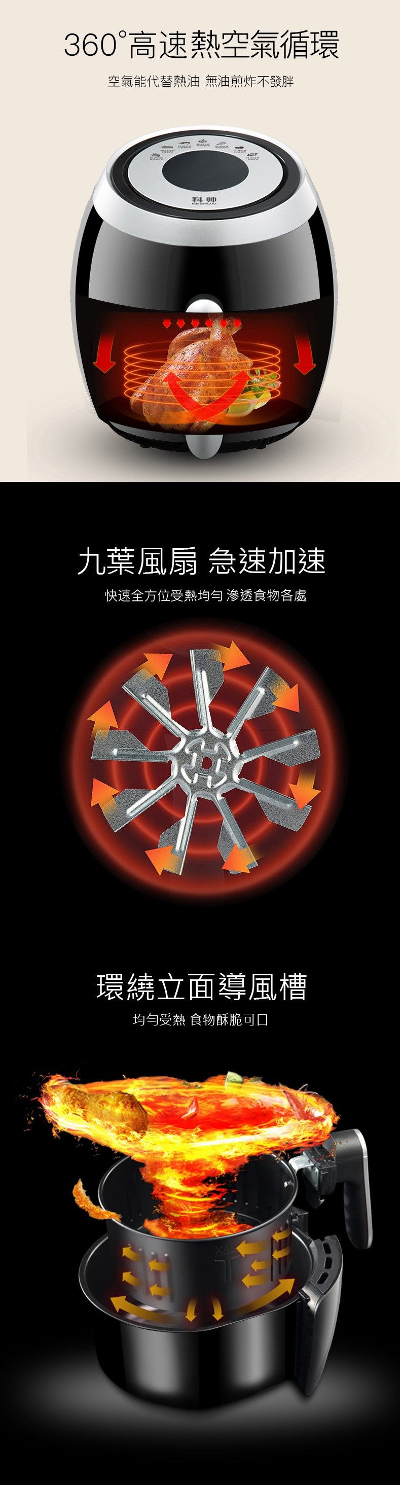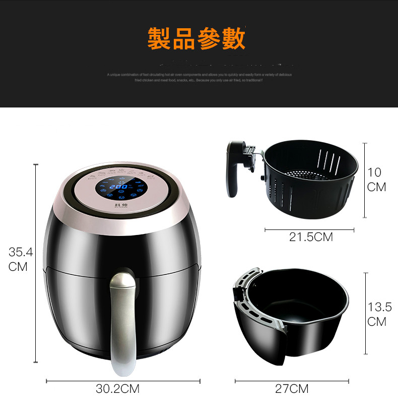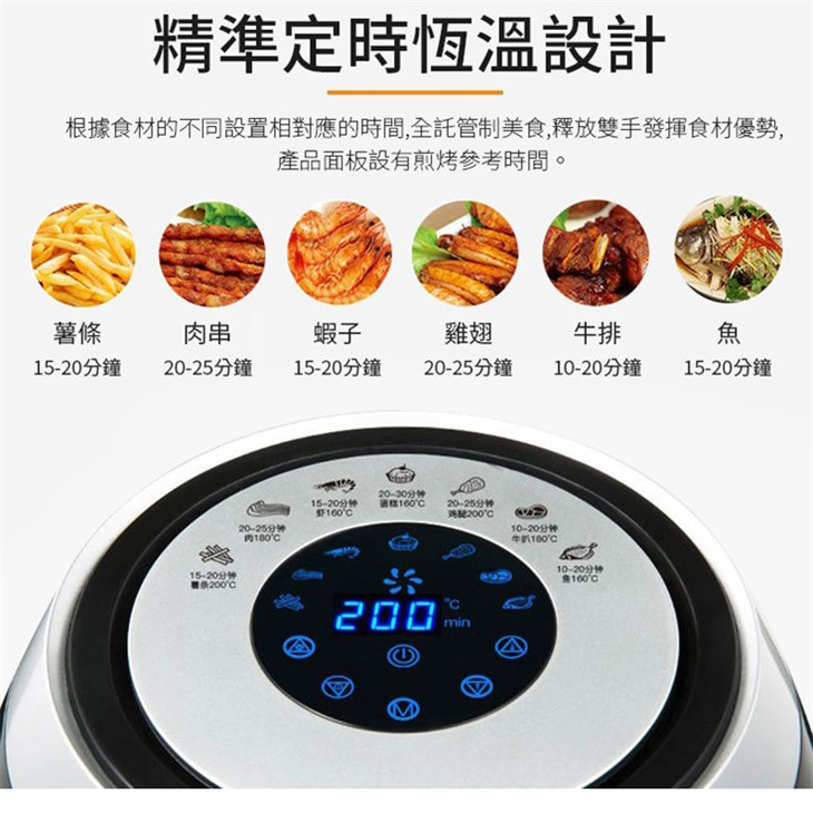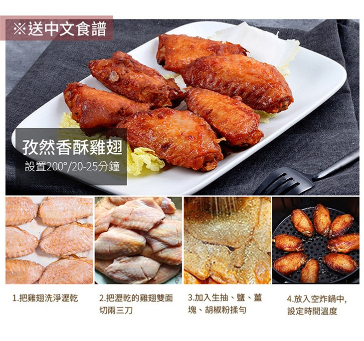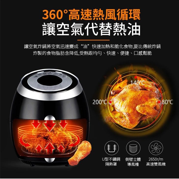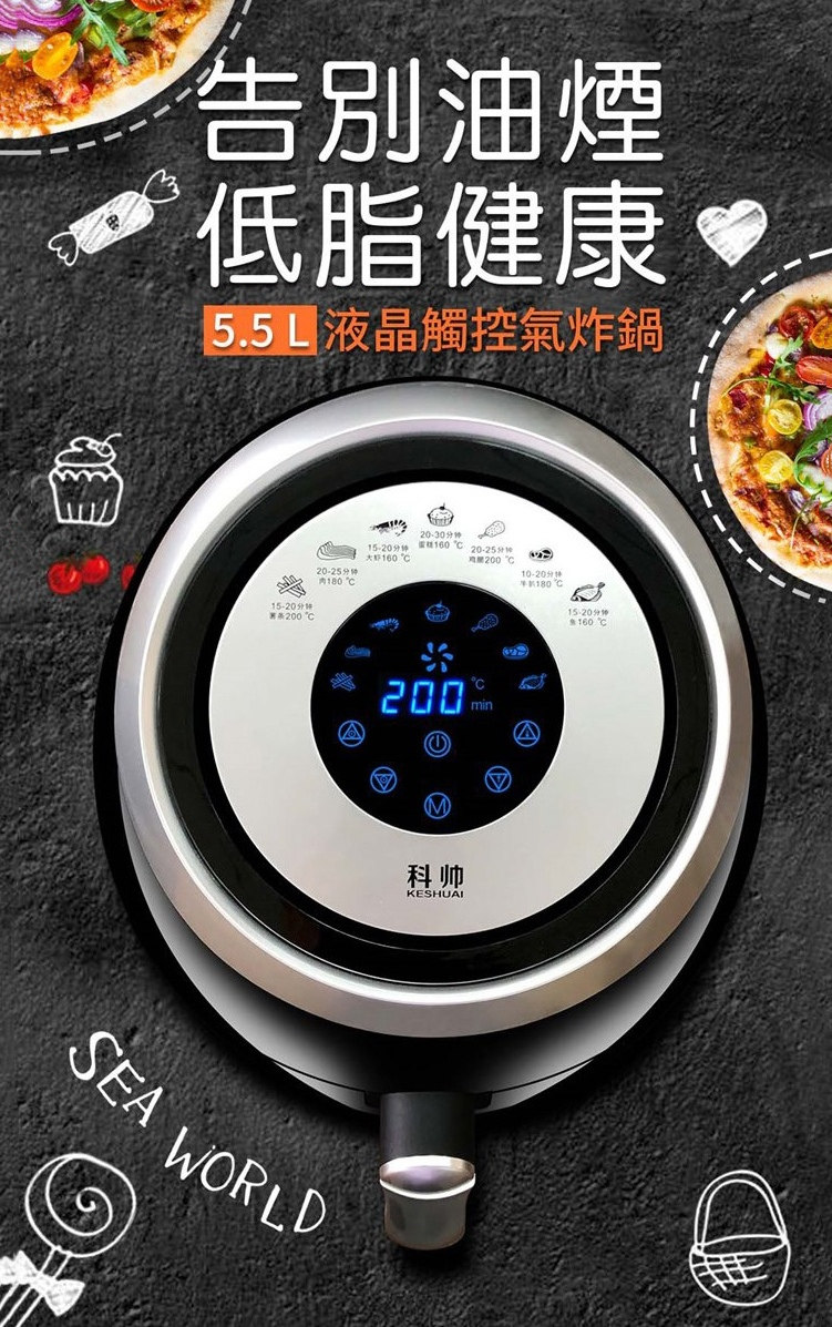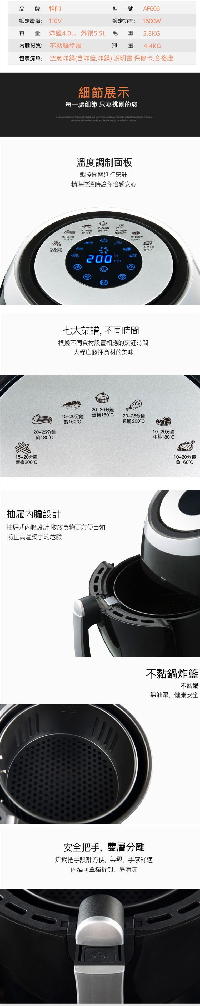 多重安全防護,通過SGS等各大安全認證 5.5L實用超大容量可炸整雞 智慧微電腦芯片菜單輕鬆做大廚 抽屜式設計防燙手,取桶斷電保護 不粘鍋易清洗,雙鍋設計實用超爽 台灣通用110V電壓,台灣本地保固