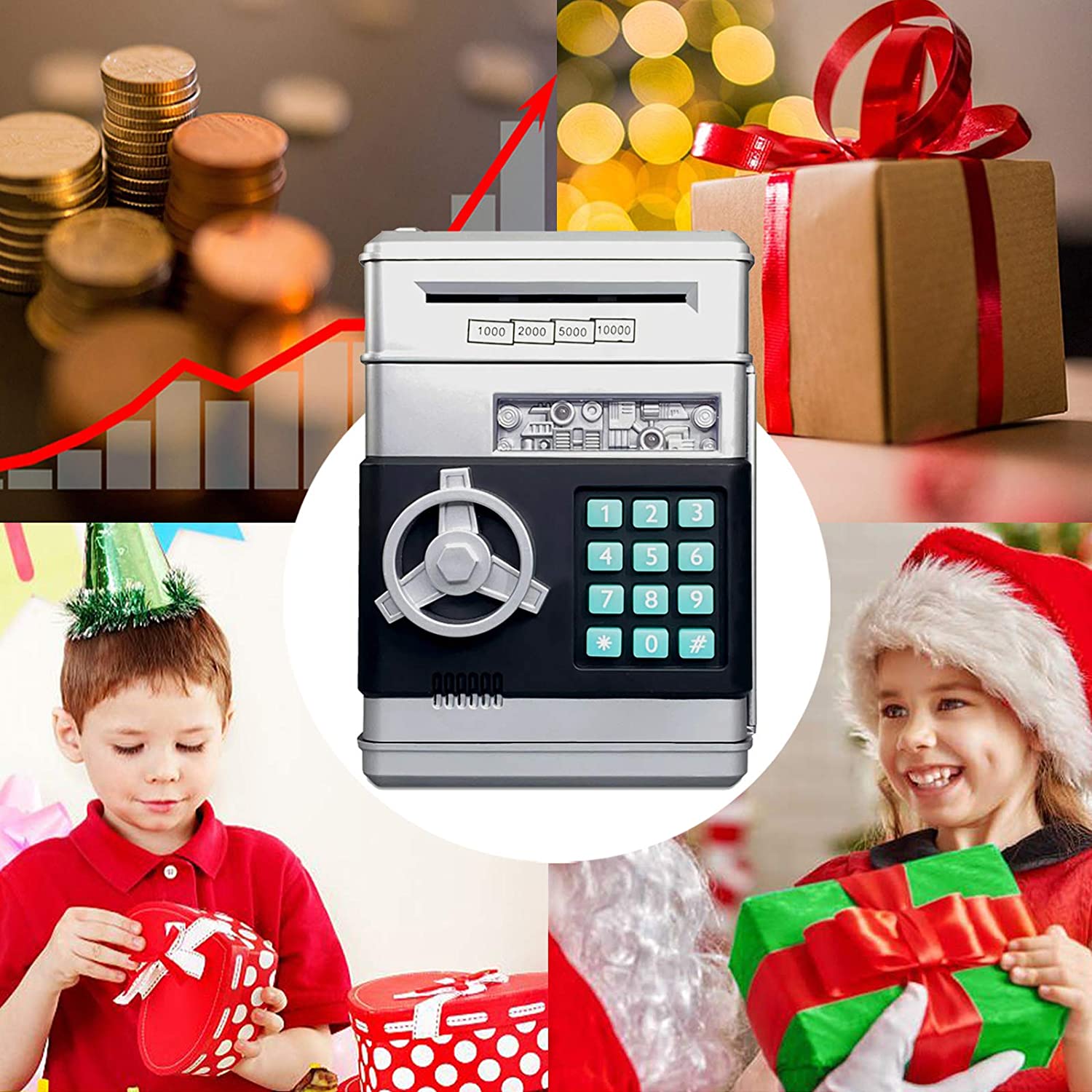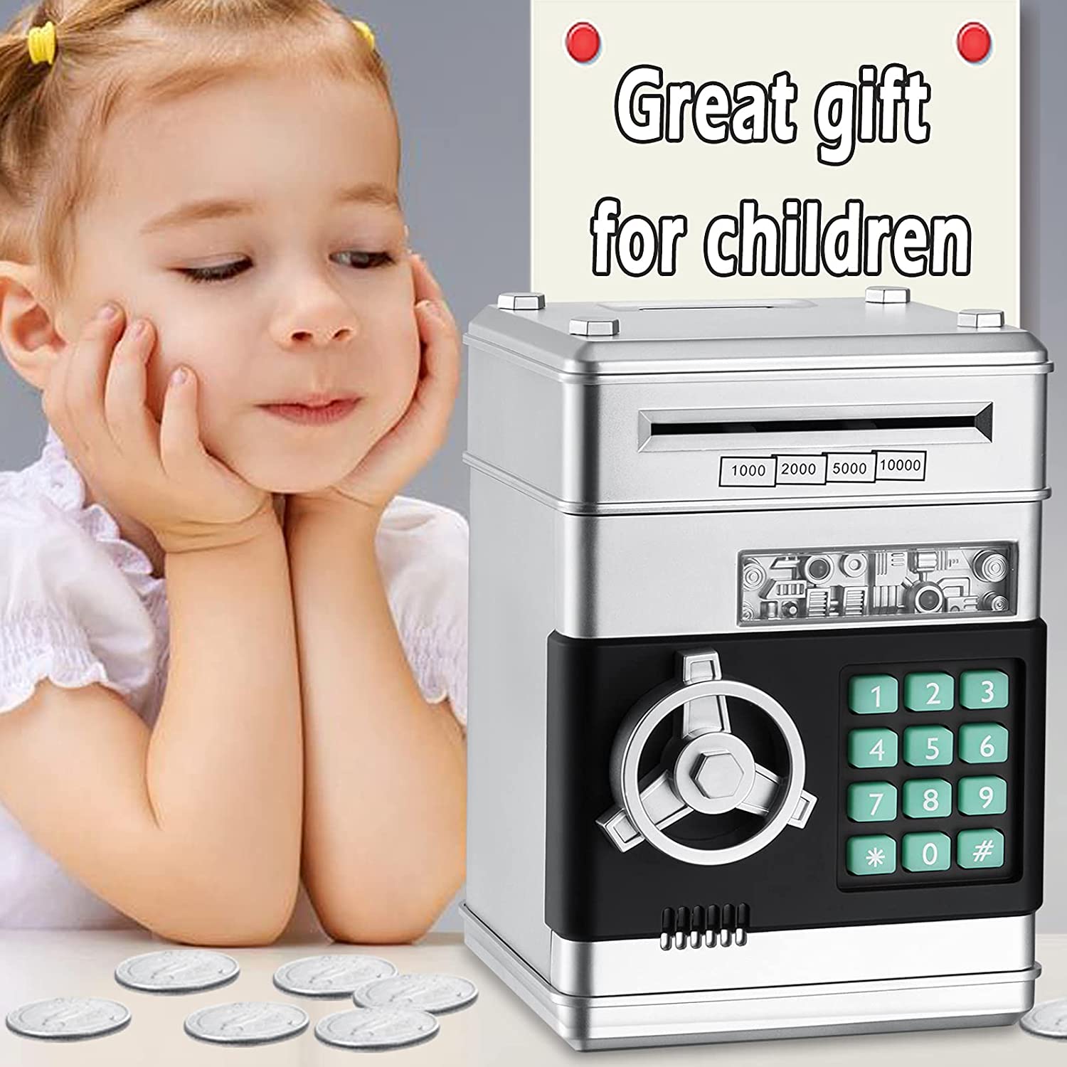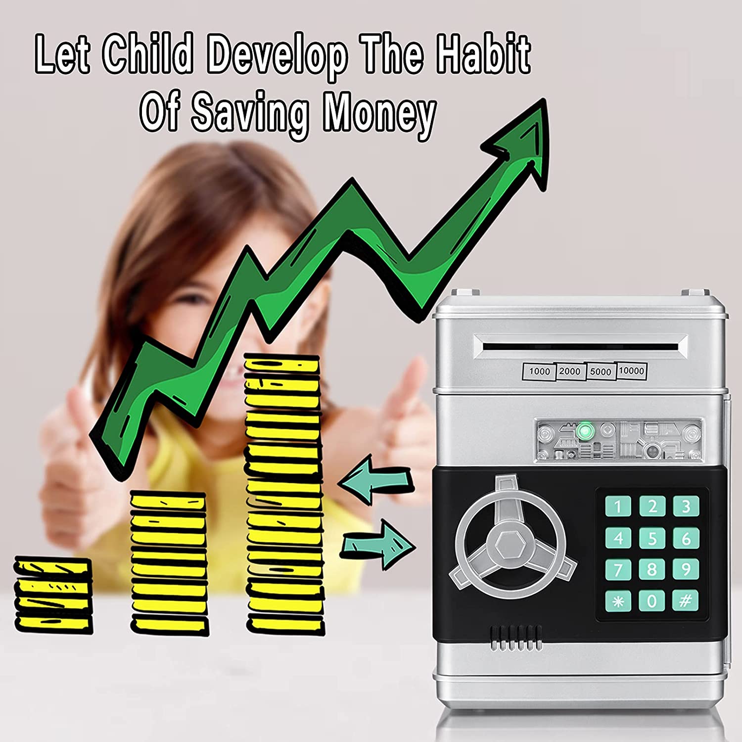 • 可以存放 600 枚硬幣或 100 張鈔票,也可存放一些個人貴重物品。幫助提高孩子的財務意識,培養省錢的習慣。 ​