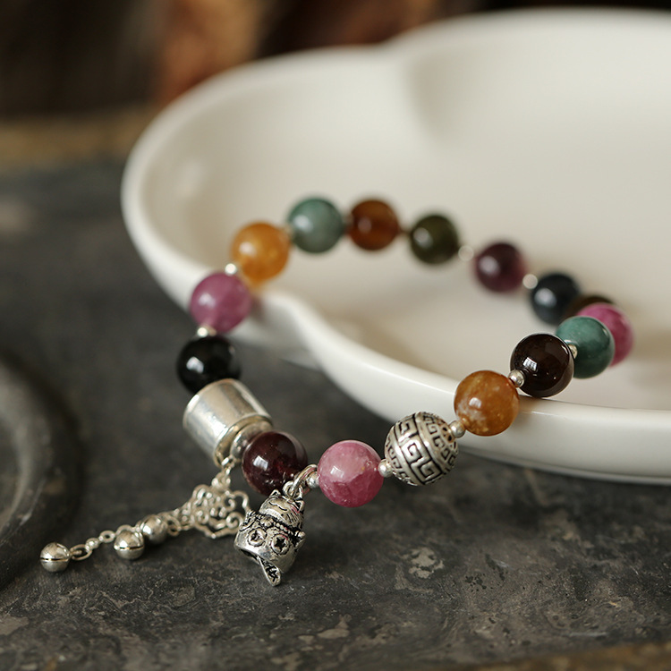 【天然碧璽配925銀招財貓】原創設計天然糖果碧璽圓珠配925純銀招財貓吊墜單圈手鍊 (天然碧璽/925銀)