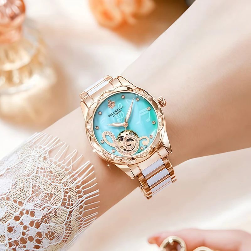 女錶・機械・時光樂章 | 全自動機械機芯 | 櫻花鑲鑽錶殼 | 音符鏤空錶盤 | 陶瓷間金錶帶 | 30米防水 | 夜光指針 | MG.ORKINA全自動機械錶女錶