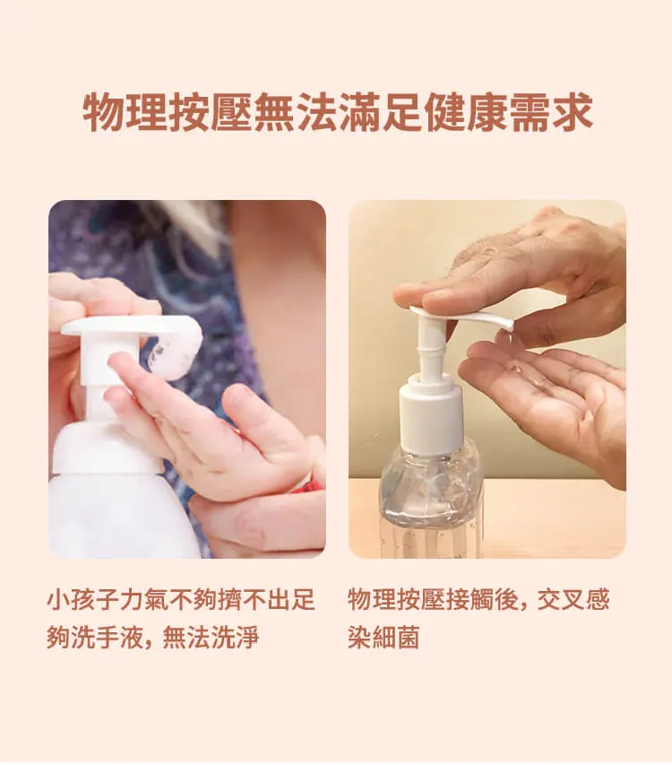 小孩子力氣小,無法擠不出洗手液,傳統物理按壓接觸後,會造成細菌交叉感染。