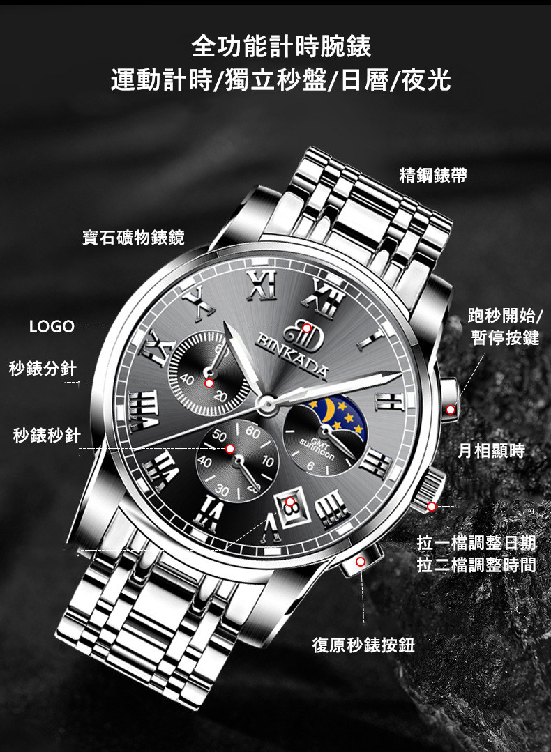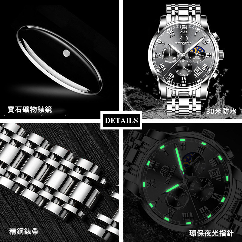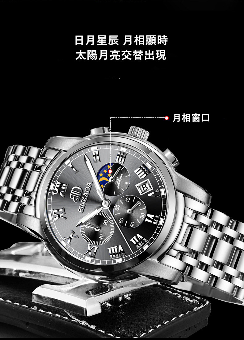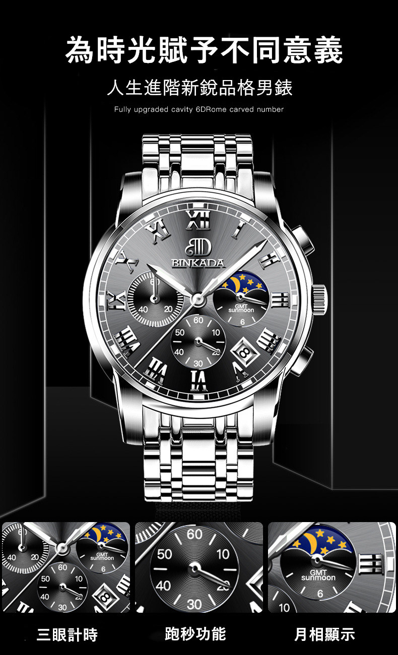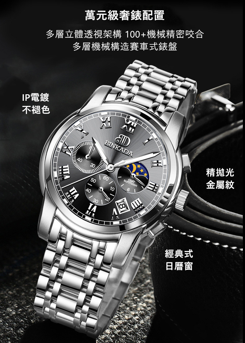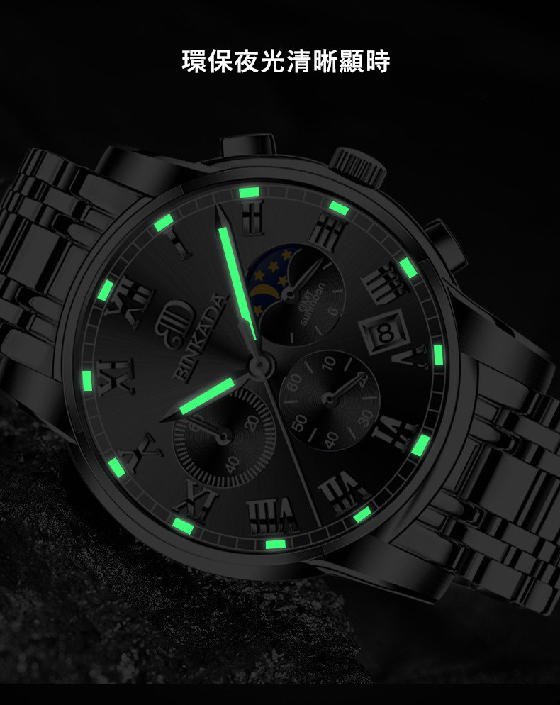 成熟型男系列 | 真月相三眼 | 跑秒計時 | 夜光防水 | 精鋼錶帶 | BINKADA專櫃全功能三眼跑秒月相日曆精鋼錶帶夜光防水手錶男錶