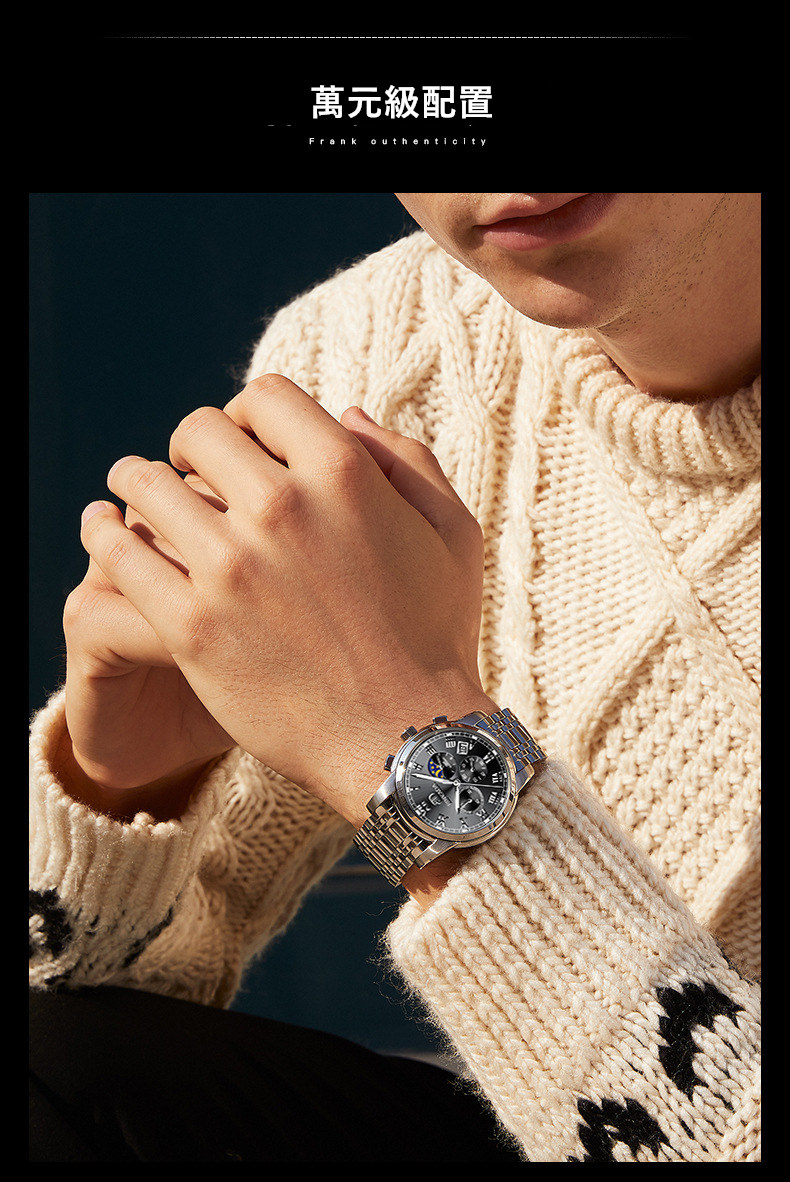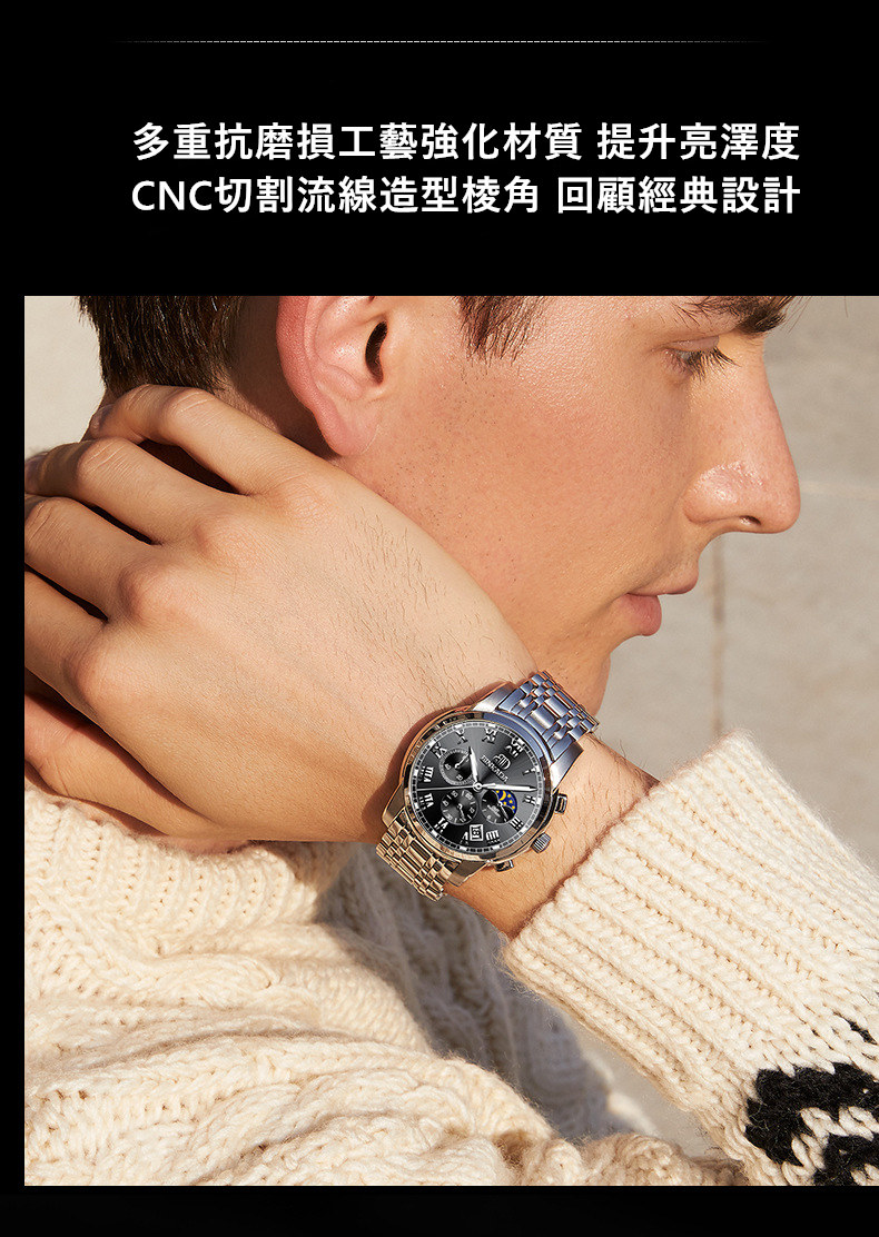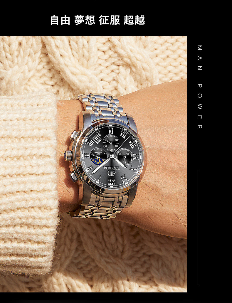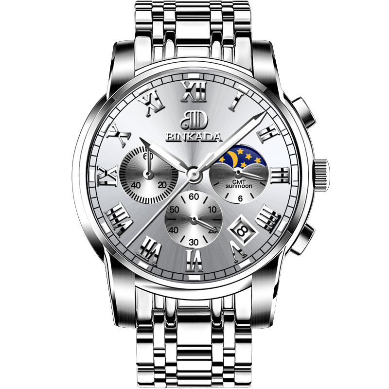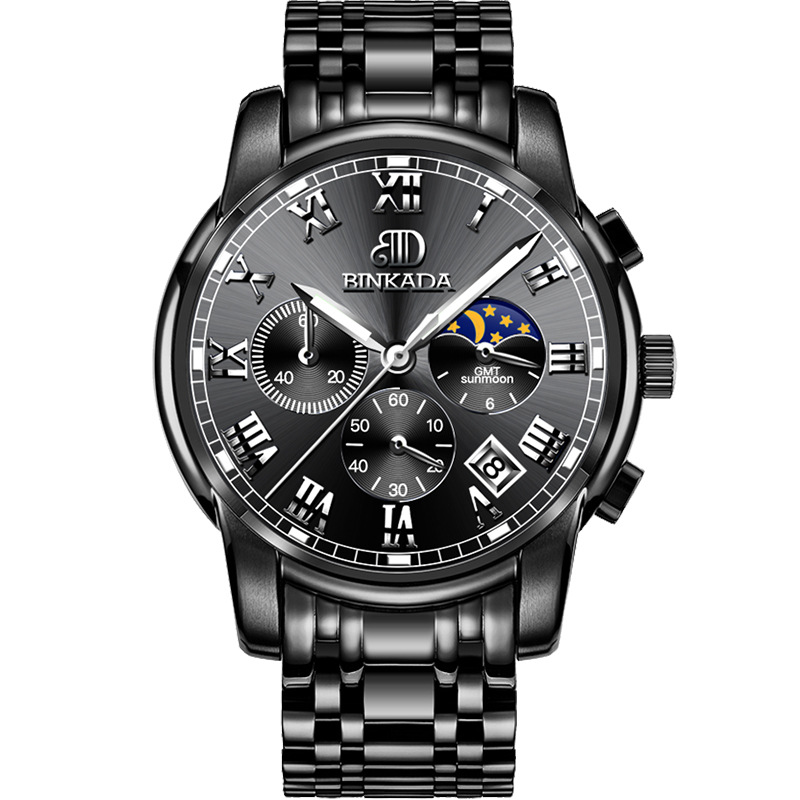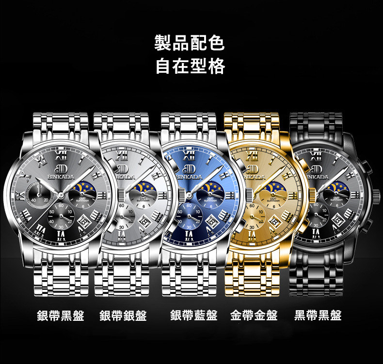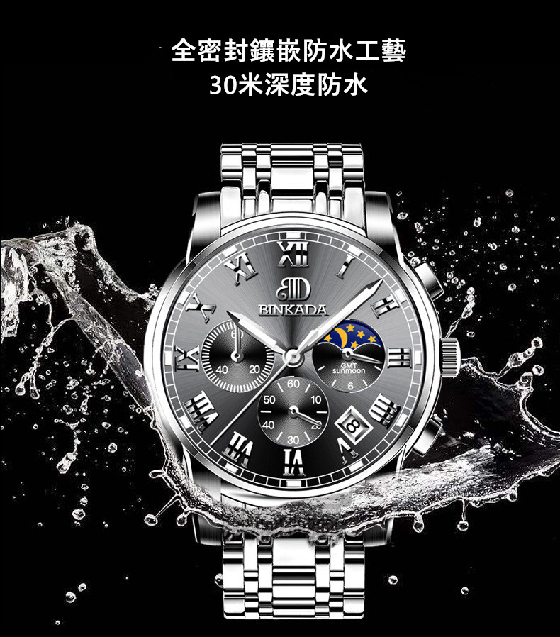 成熟型男系列 | 真月相三眼 | 跑秒計時 | 夜光防水 | 精鋼錶帶 | BINKADA專櫃全功能三眼跑秒月相日曆精鋼錶帶夜光防水手錶男錶