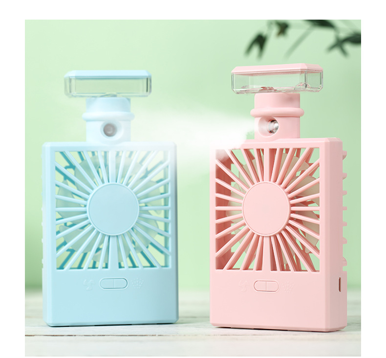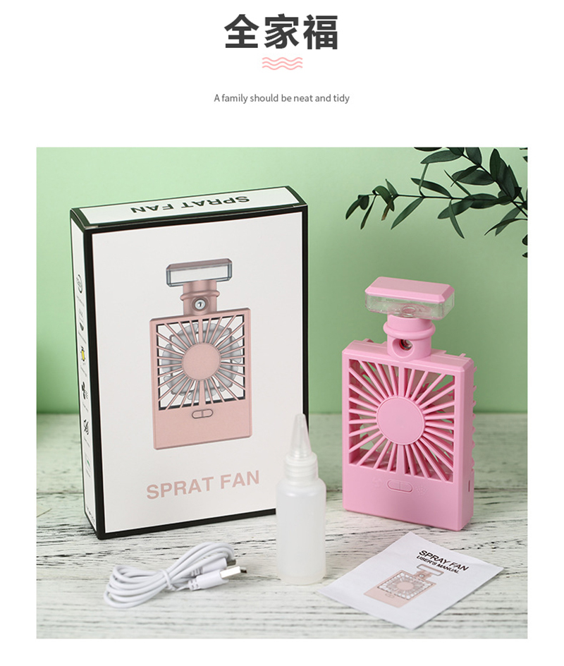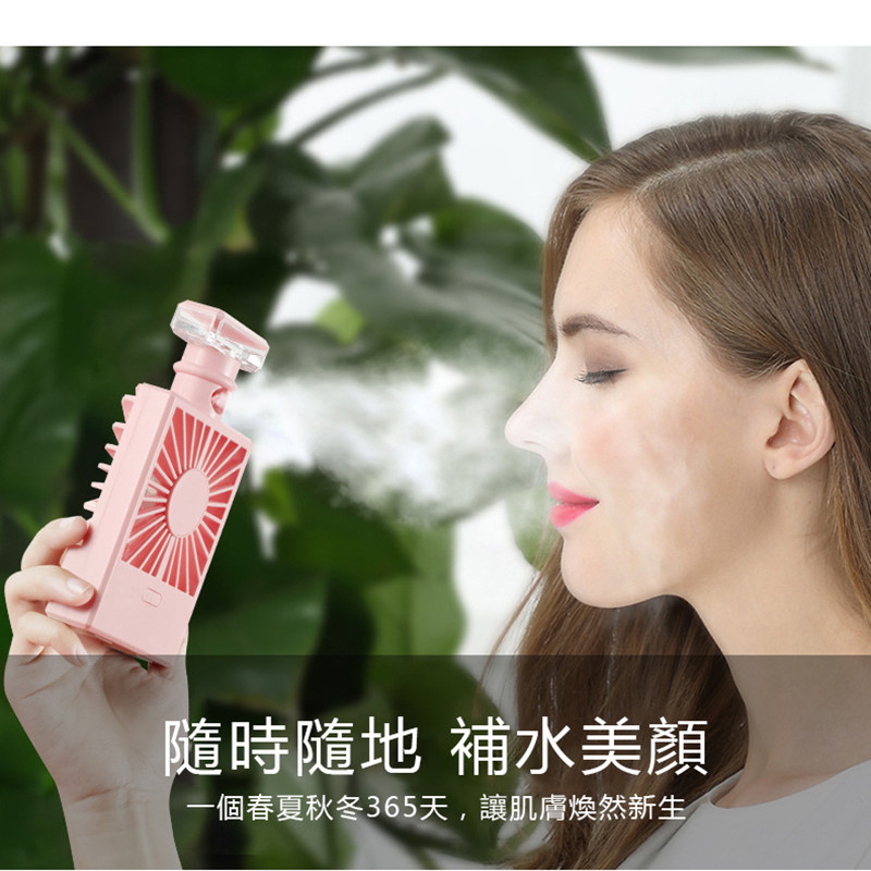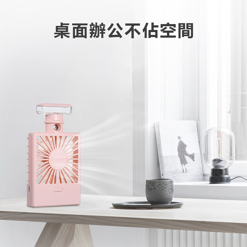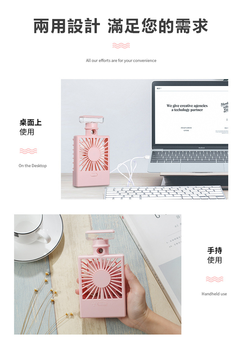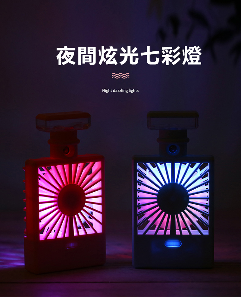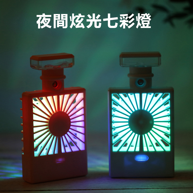 【香水造型USB充電小風扇】【奈米霧化噴霧加濕】【七彩夜燈】個性時尚香水造型噴霧加濕帶夜燈USB充電台式手持兩用小風扇