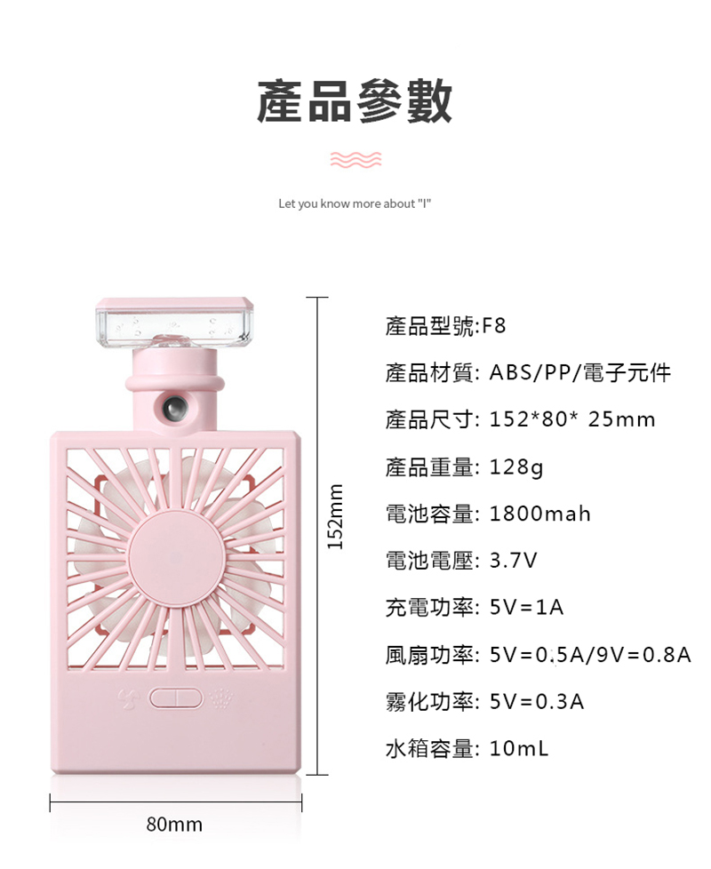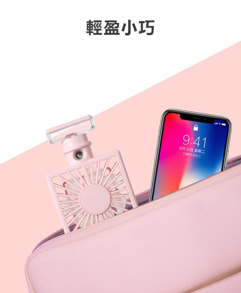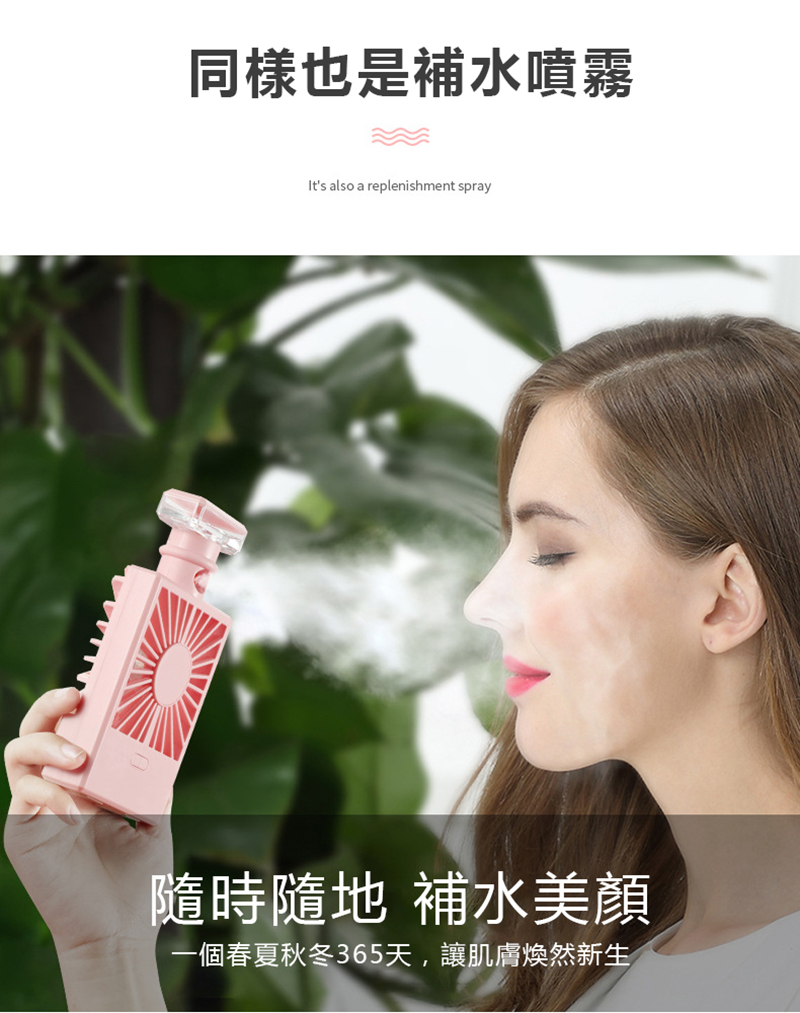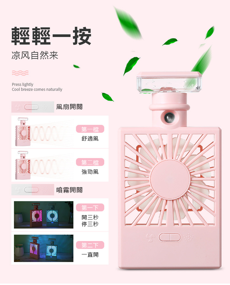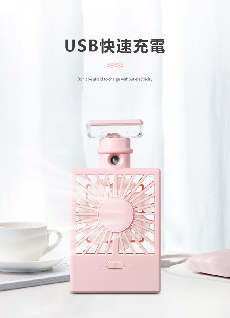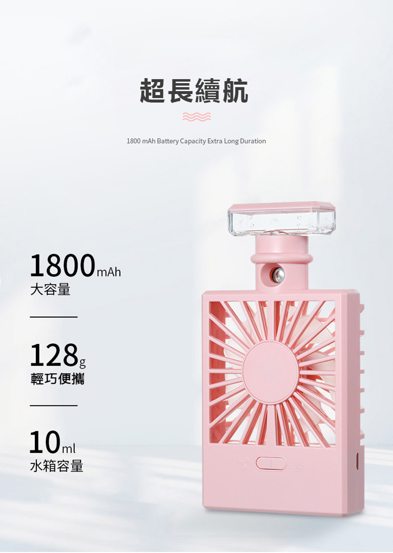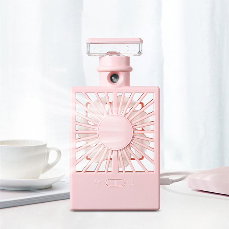 【香水造型USB充電小風扇】【奈米霧化噴霧加濕】【七彩夜燈】個性時尚香水造型噴霧加濕帶夜燈USB充電台式手持兩用小風扇