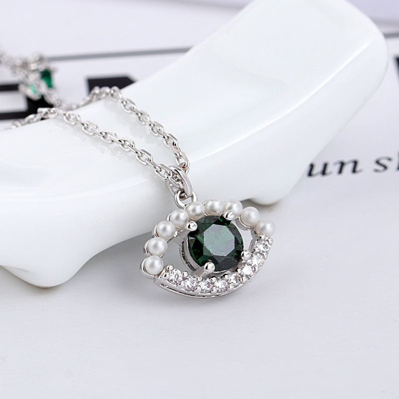 輕奢經典新版惡魔之眼精工珍珠微鑲水鑽白金色鎖骨鍊項鍊 (白金色)