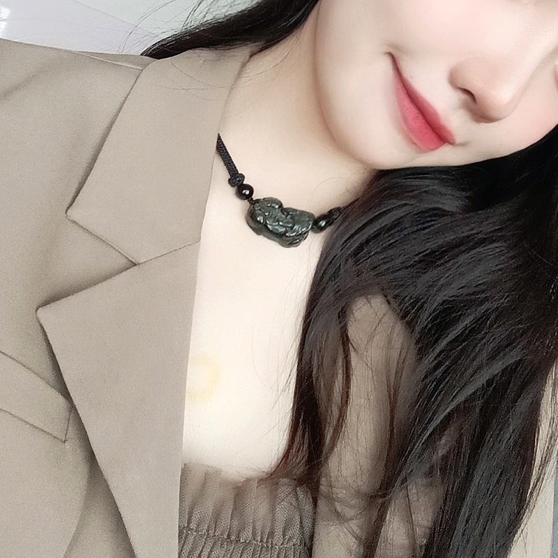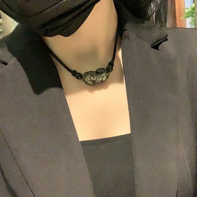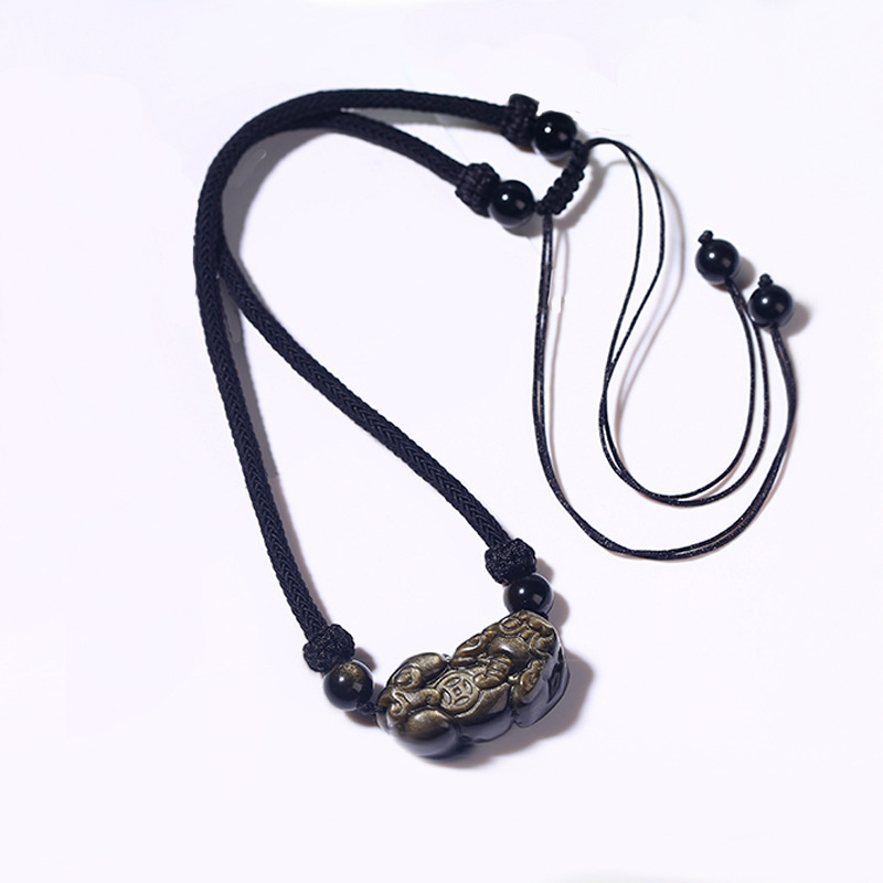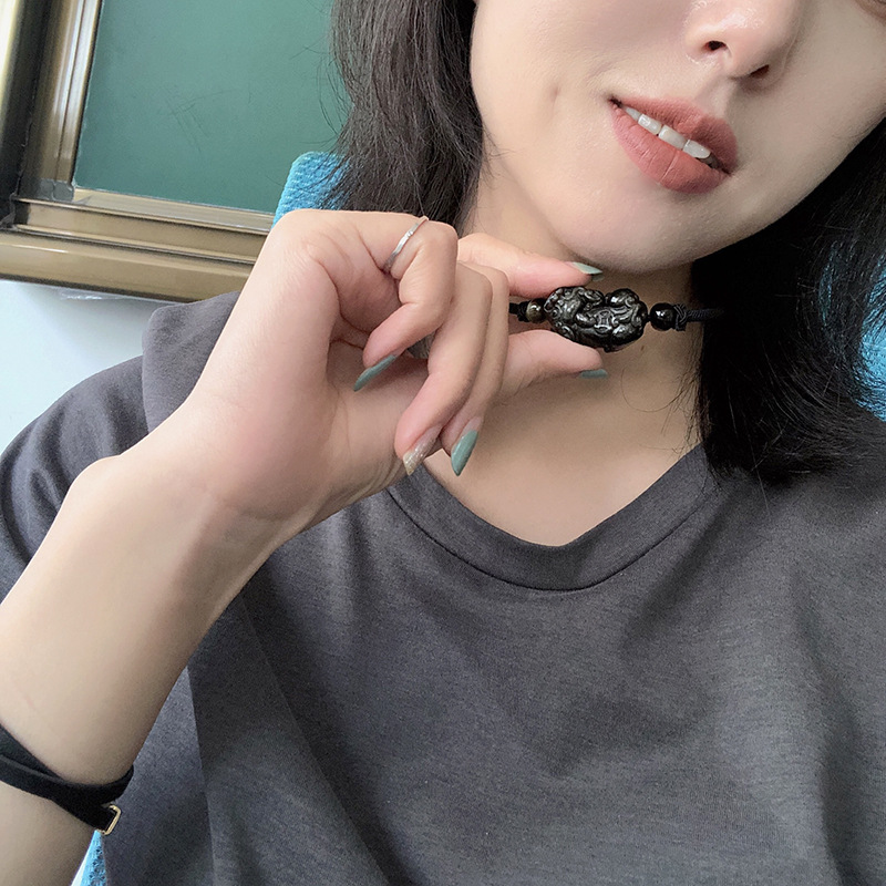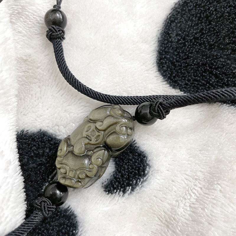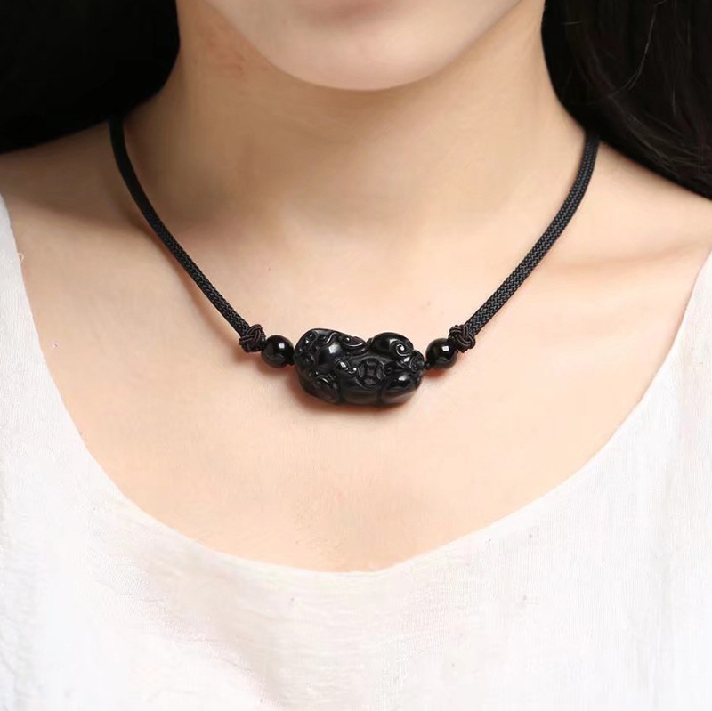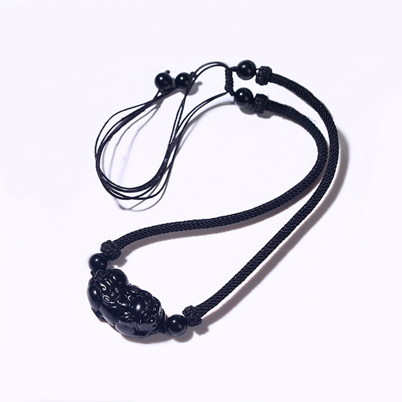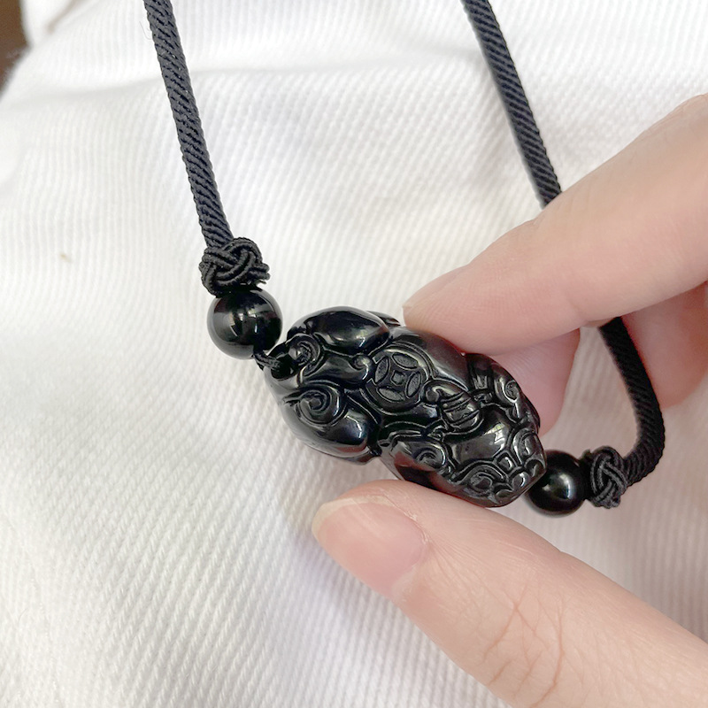天然黑曜石貔貅 | 手工精雕 | 幸運編織繩項鍊 | 招財開運精雕天然黑曜石背錢貔貅吊墜可調節編織繩項鍊鎖骨鍊