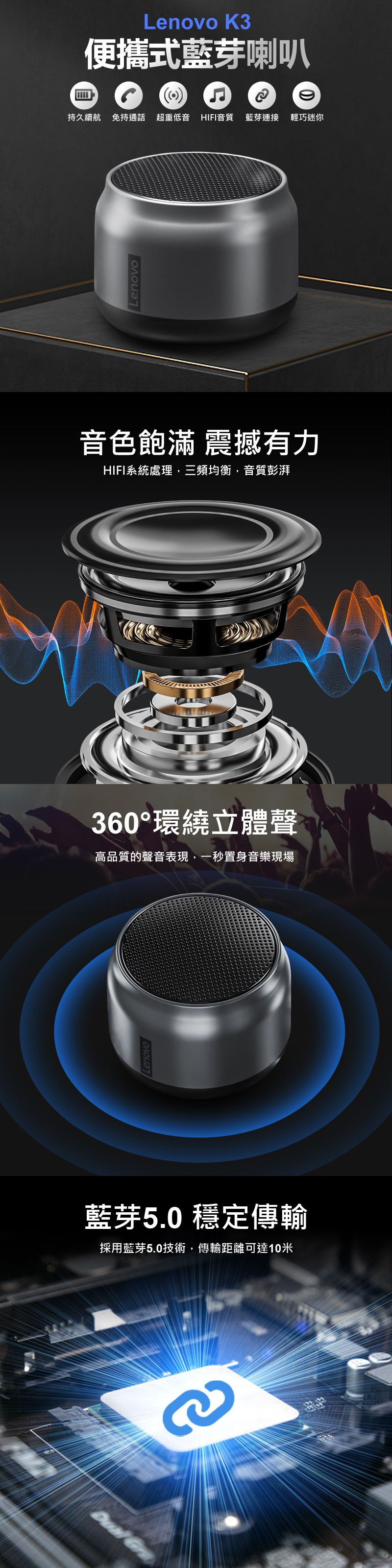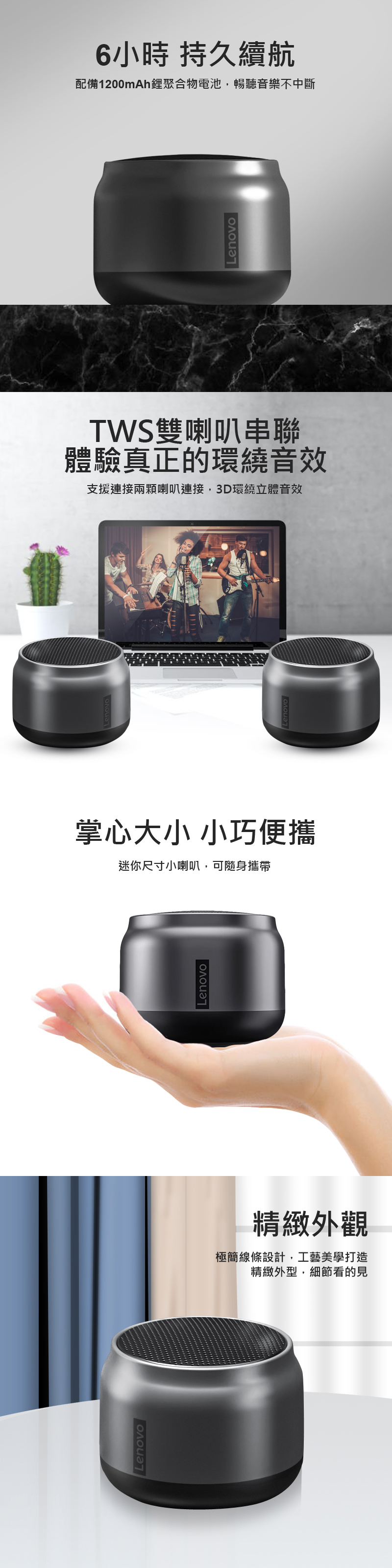 HIFI音質超重低音 | 360環繞立體聲 | 免提通話 | 藍牙5.0穩定連接 | 輕巧便攜 | 持久續航 | LENOVO精緻槍色迷你TWS無線藍牙喇叭音箱