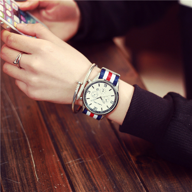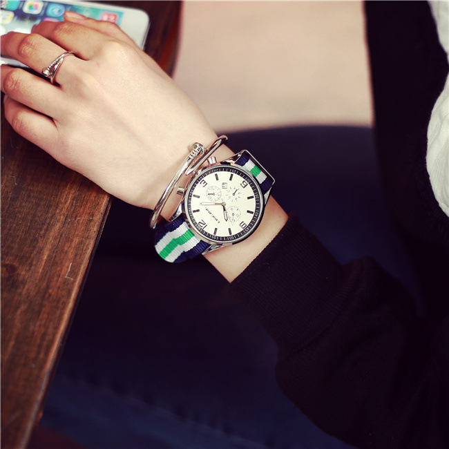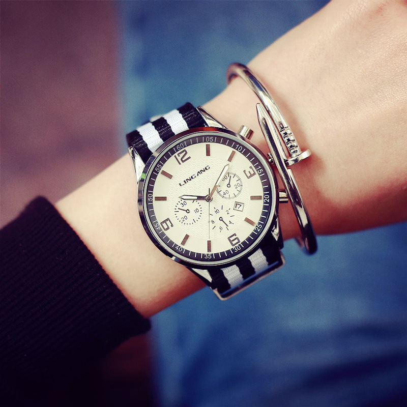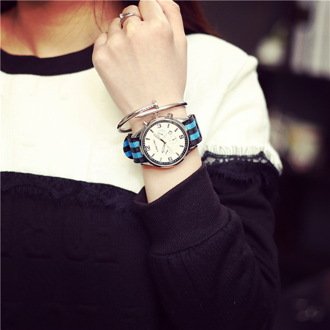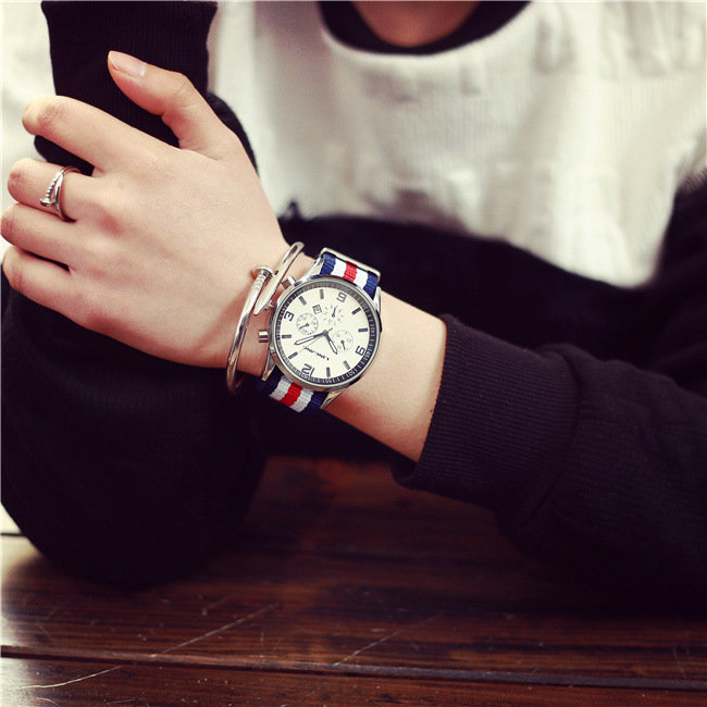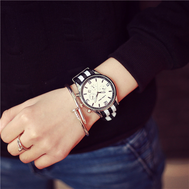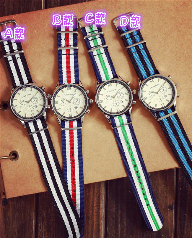 韓過熱銷GD風格條紋尼龍錶帶男女中性石英手錶
