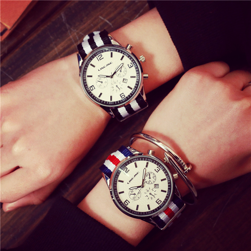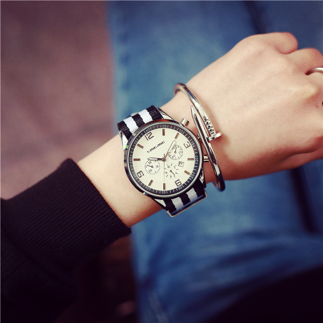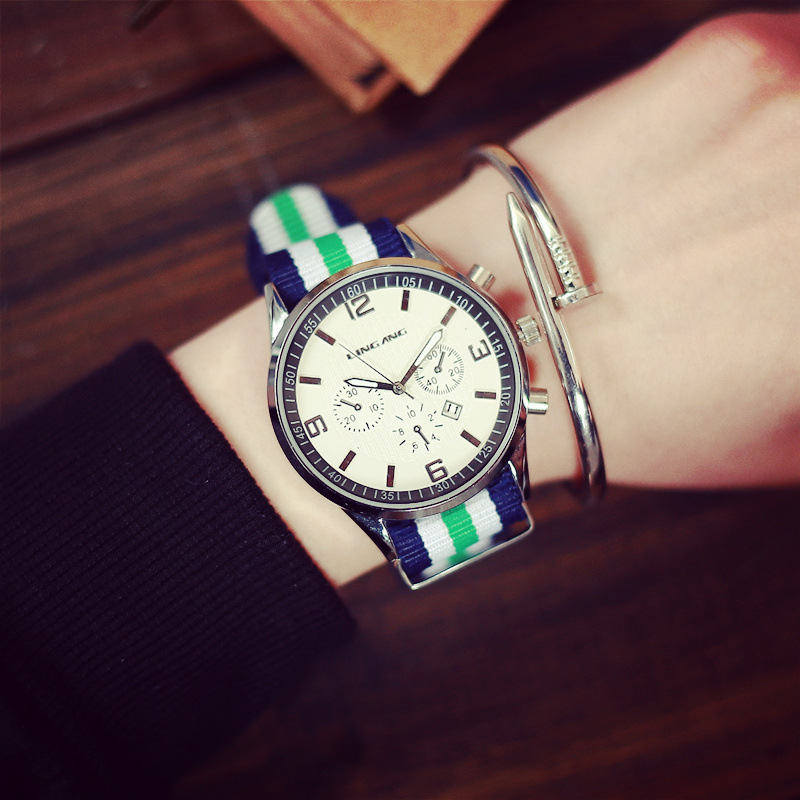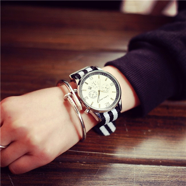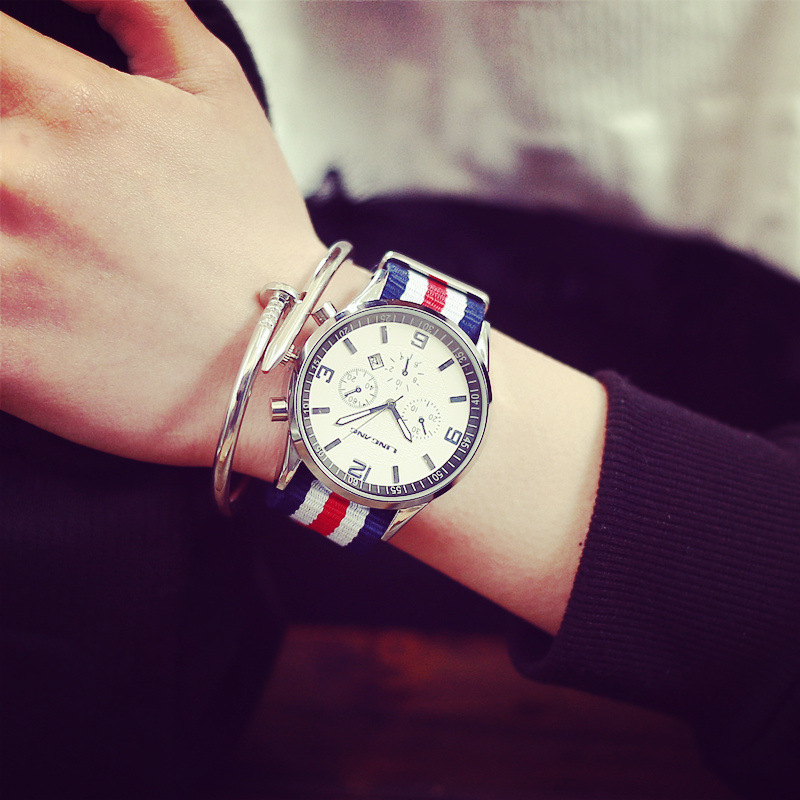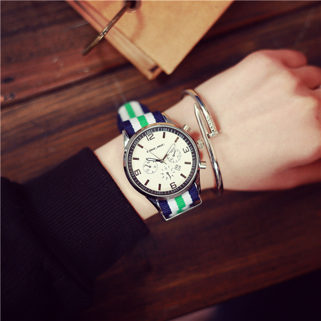 韓過熱銷GD風格條紋尼龍錶帶男女中性石英手錶