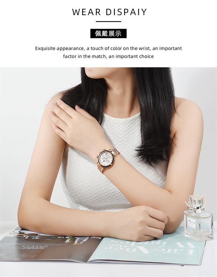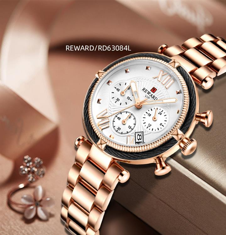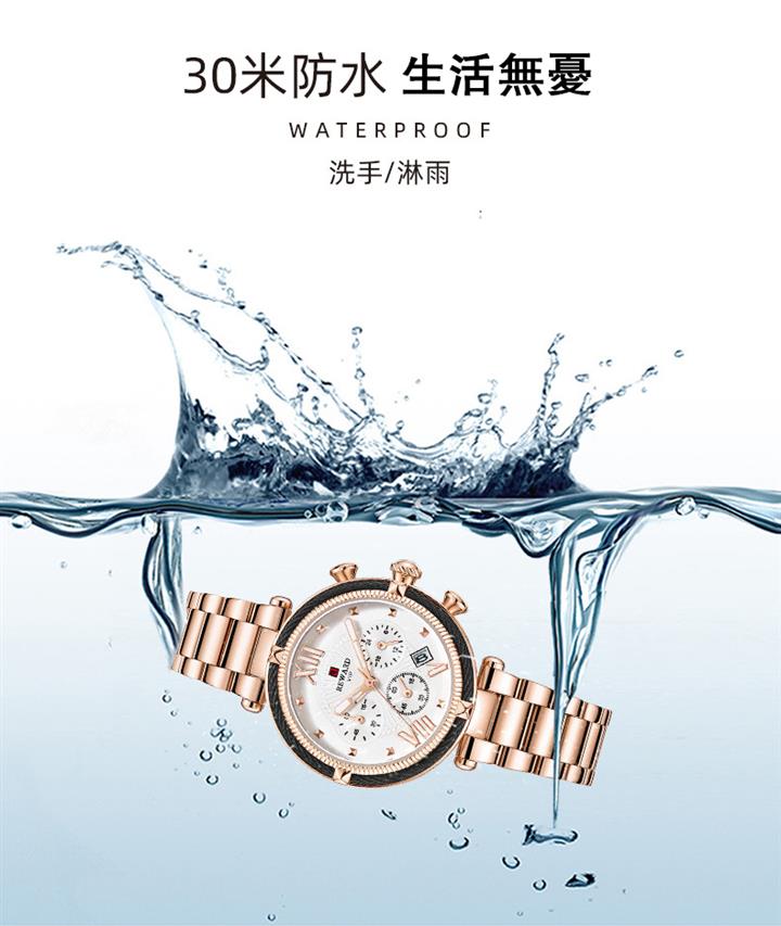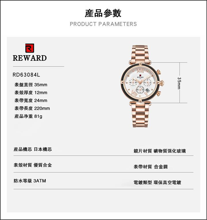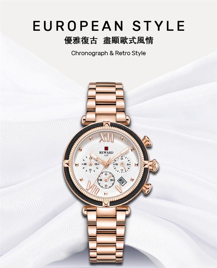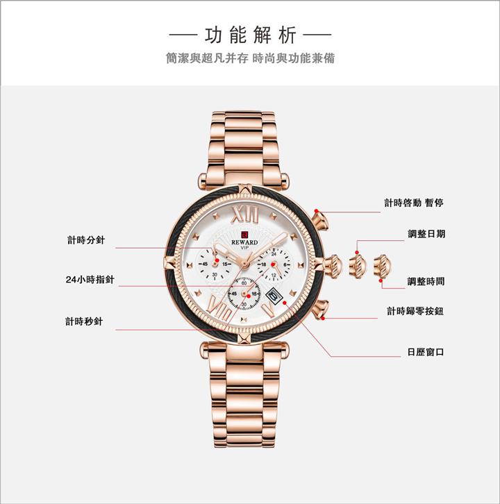 真三眼計時 | 超薄錶盤 | 玫金鋼帶 | 3ATM防水 | REWARD真三眼輕奢玫瑰金鋼帶女石英手錶