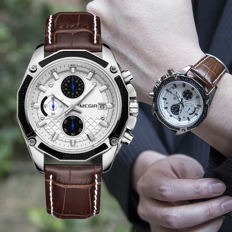 男錶・極速信仰 | 賽車風格運動錶盤 | 真三眼六針機芯 | 真皮錶帶 | 日曆視窗 | 強視夜光 | MEGIR賽車手系列多功能運動手錶