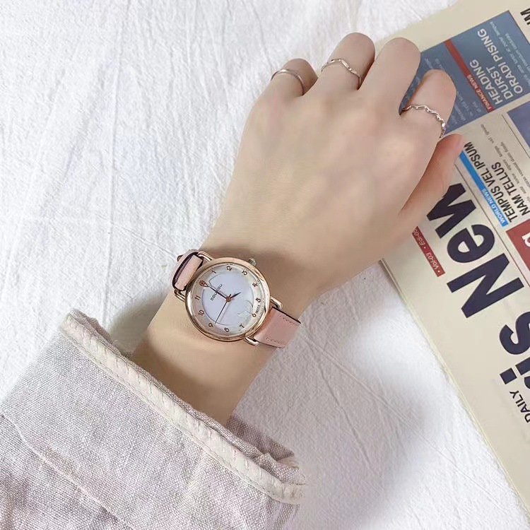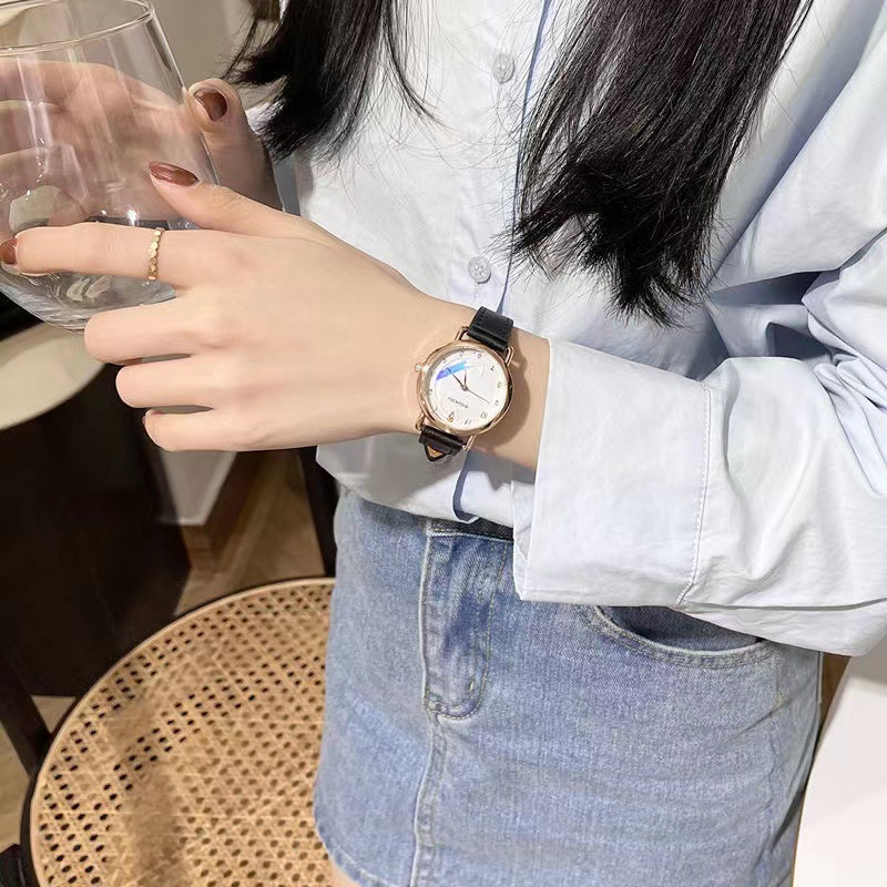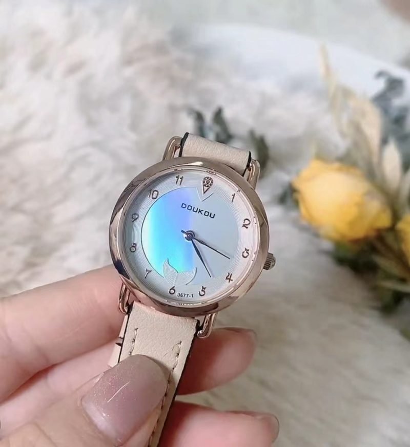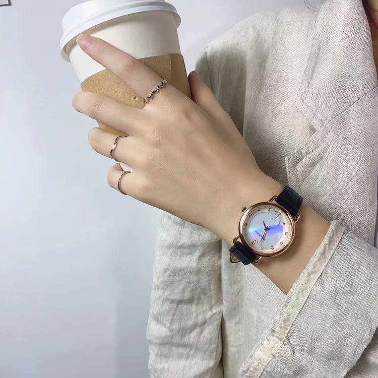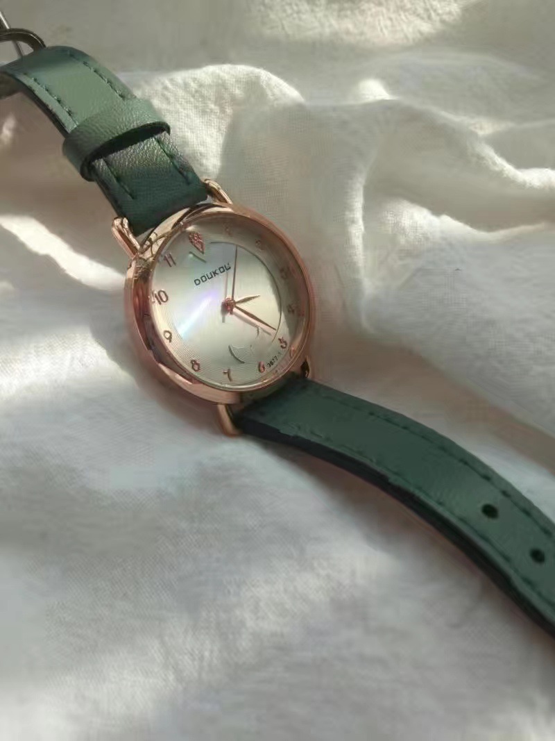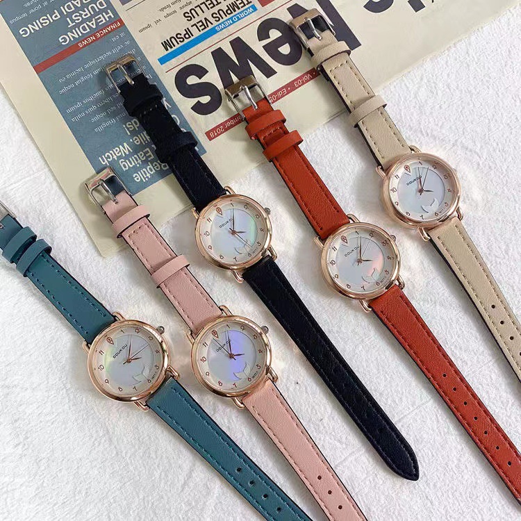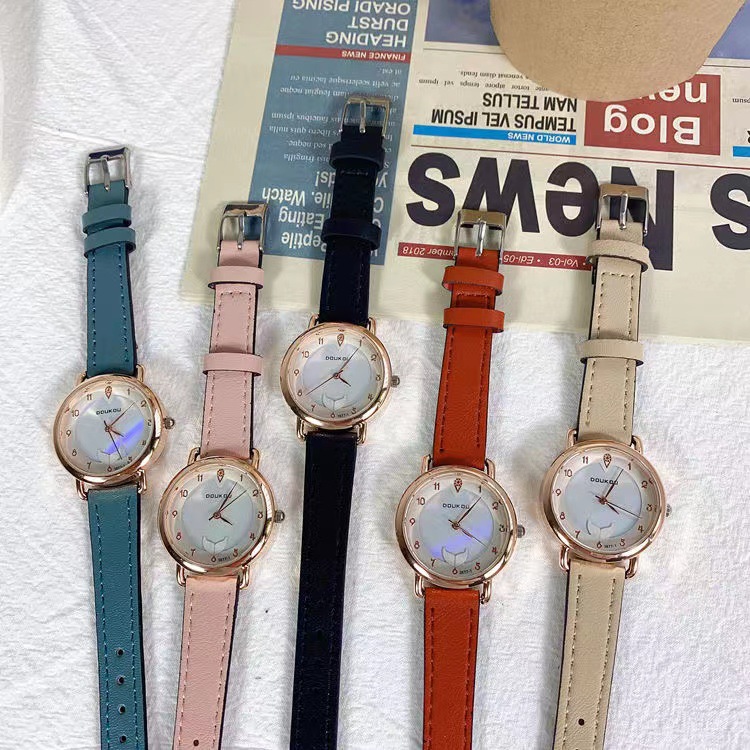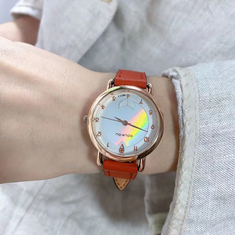 DOUKOU腕間彩虹系列韓版優雅氣質玫金圓盤皮帶女手錶石英錶