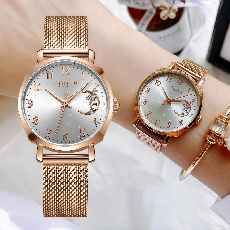 女錶・皎月繁星 | 日本星辰機芯 | 月相日曆視窗 | 精緻星空錶盤 | 米蘭尼斯網帶 | 30米防水 | JULIUS正韓氣質名媛浪漫高級女士手錶