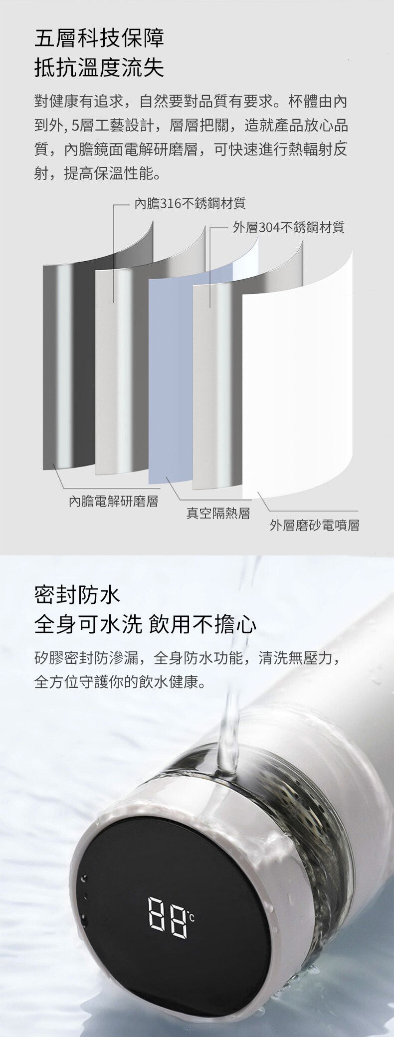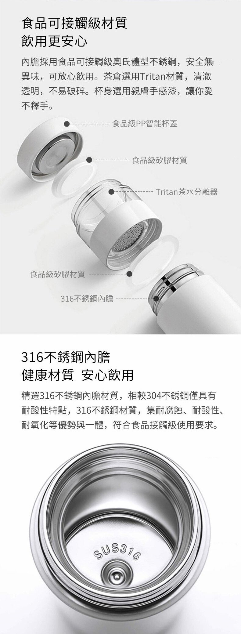 智慧輕觸顯溫 | 安全316奧氏不鏽鋼內膽 | 茶水分離獨立茶倉 | 長效鎖溫保溫保冷 | 智慧顯溫316奧氏體不鏽鋼內膽保溫杯保溫瓶