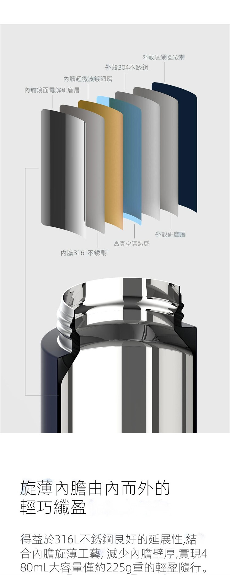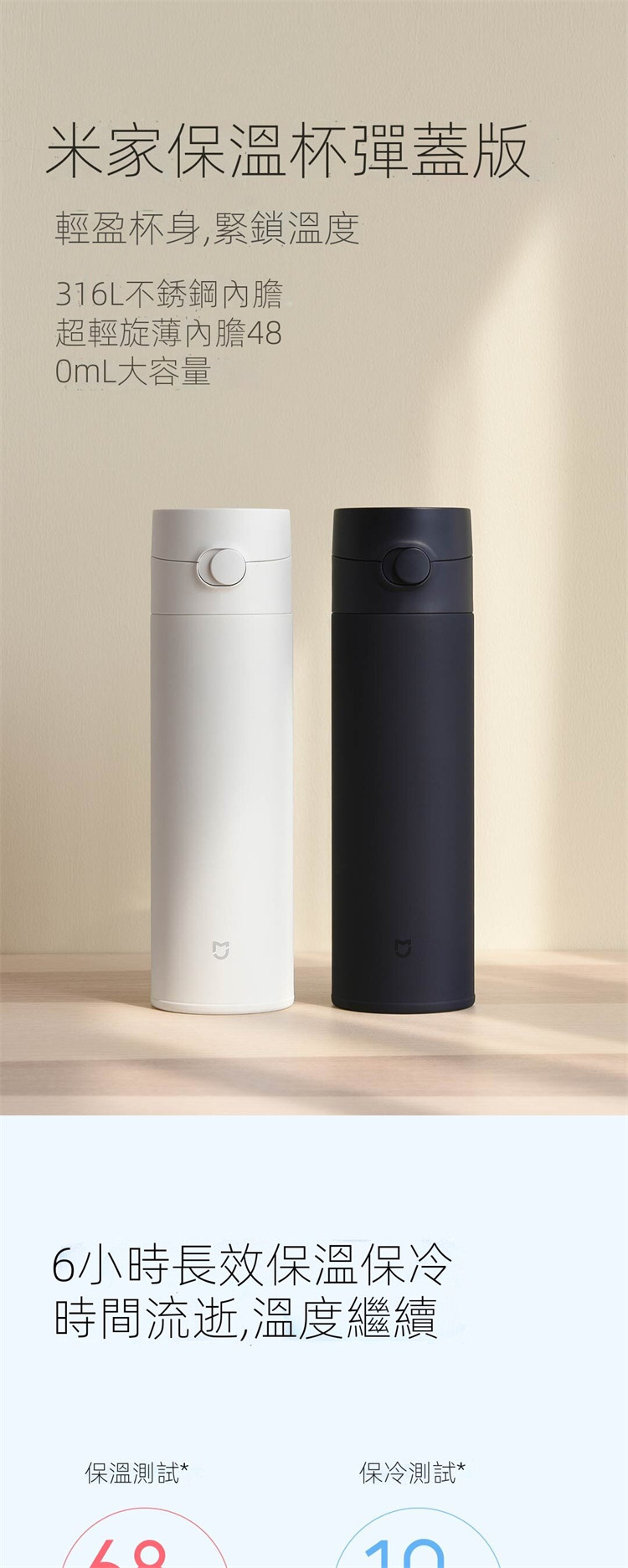 超輕旋薄內膽大容量 | 便捷彈跳杯蓋 | 安全316不鏽鋼 | 科技鍍銅反射真空隔熱 | 長效保溫鎖溫 | 科技超輕設計480ml大容量彈跳保溫瓶保溫杯