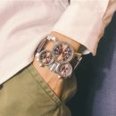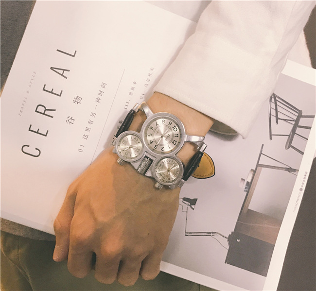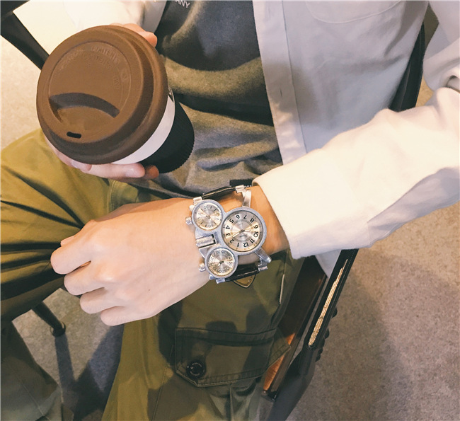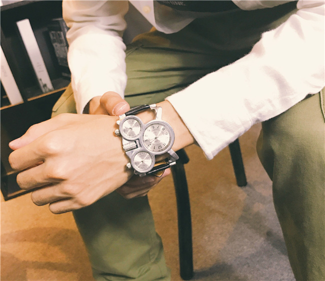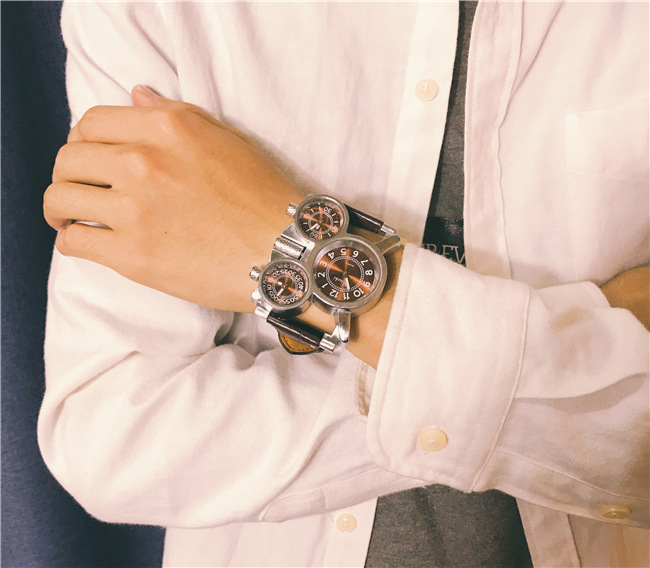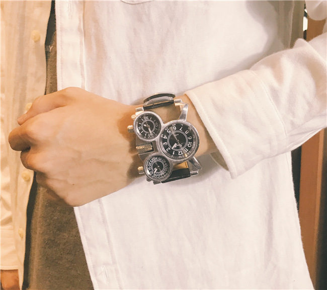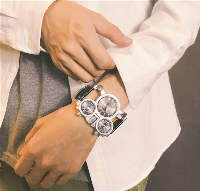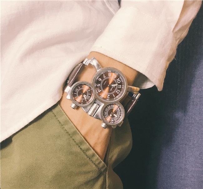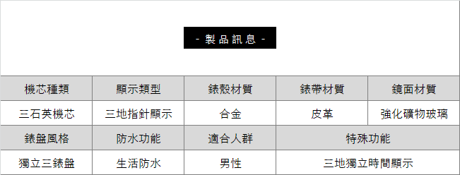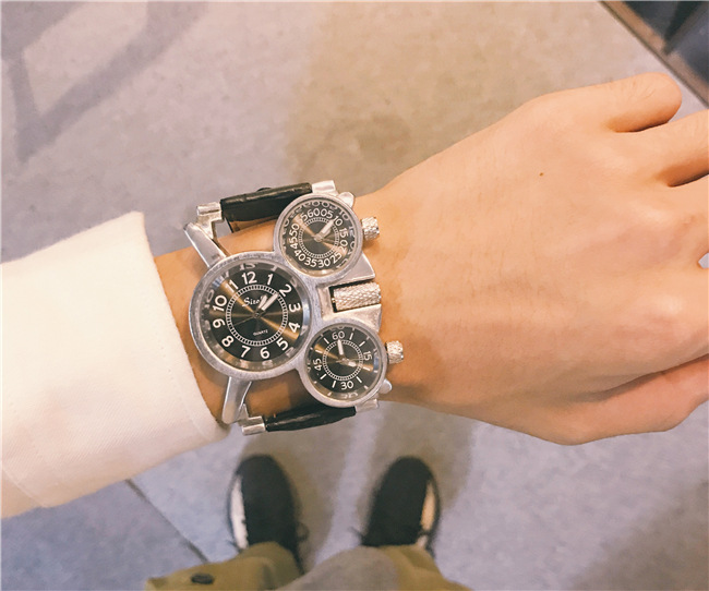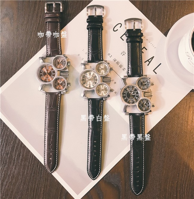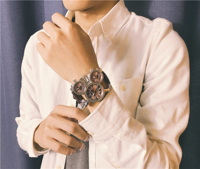 【獨立三錶盤】【搖滾元素】三地時間顯示個性復古男士三石英機芯腕錶
