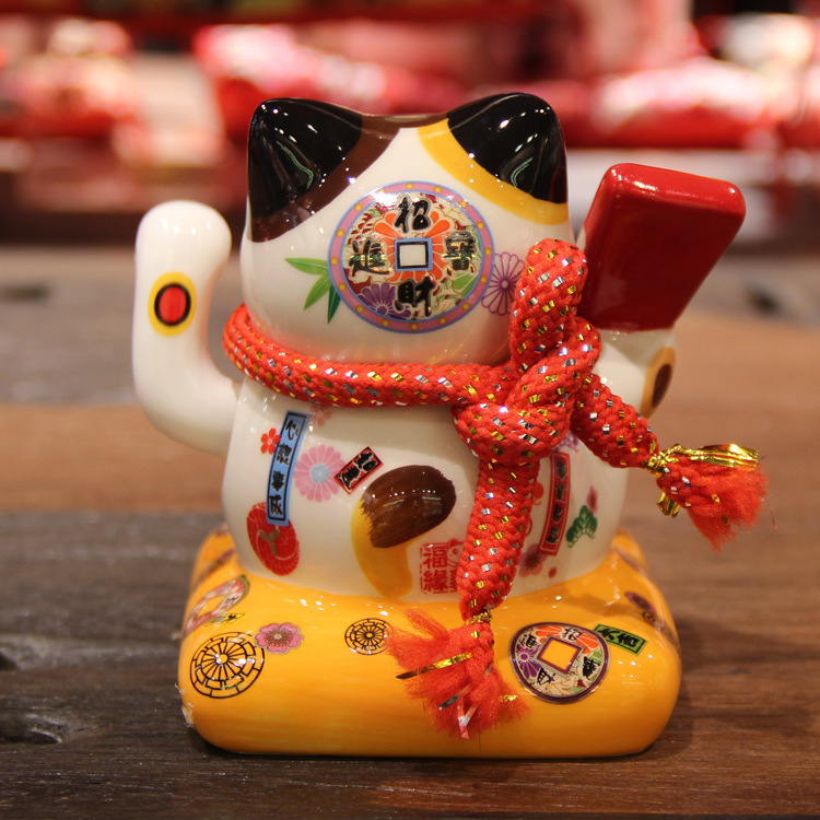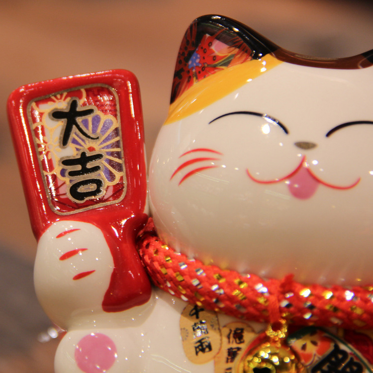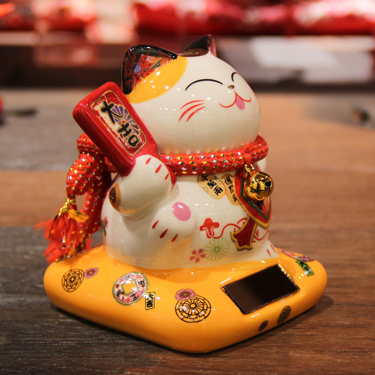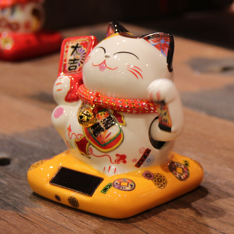 【太陽能搖手大吉招財貓】【中小號】純手工製彩繪陶瓷日式大吉太陽能搖手招財貓 (10*9*11cm)